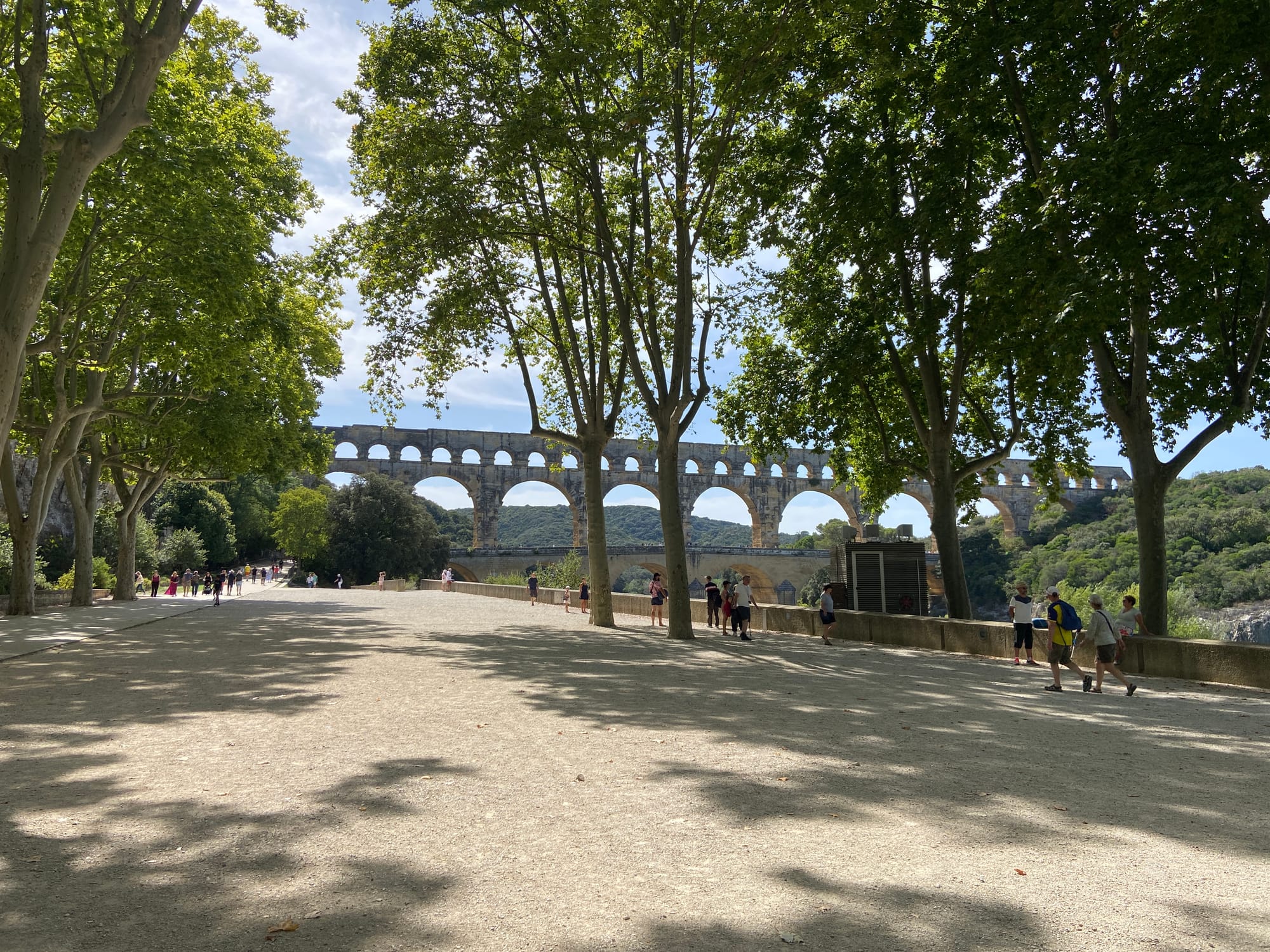 After a fantastic lunch spread in Graveson, our next stop was the Pont du Gard aqueduct near Remoulins. The ancient structure rose dramatically above the Gardon River, its three tiers of arches perfectly balanced — an incredible feat of Roman engineering. Hard to believe it was built nearly 2,000 years ago to carry water all the way to Nîmes.
