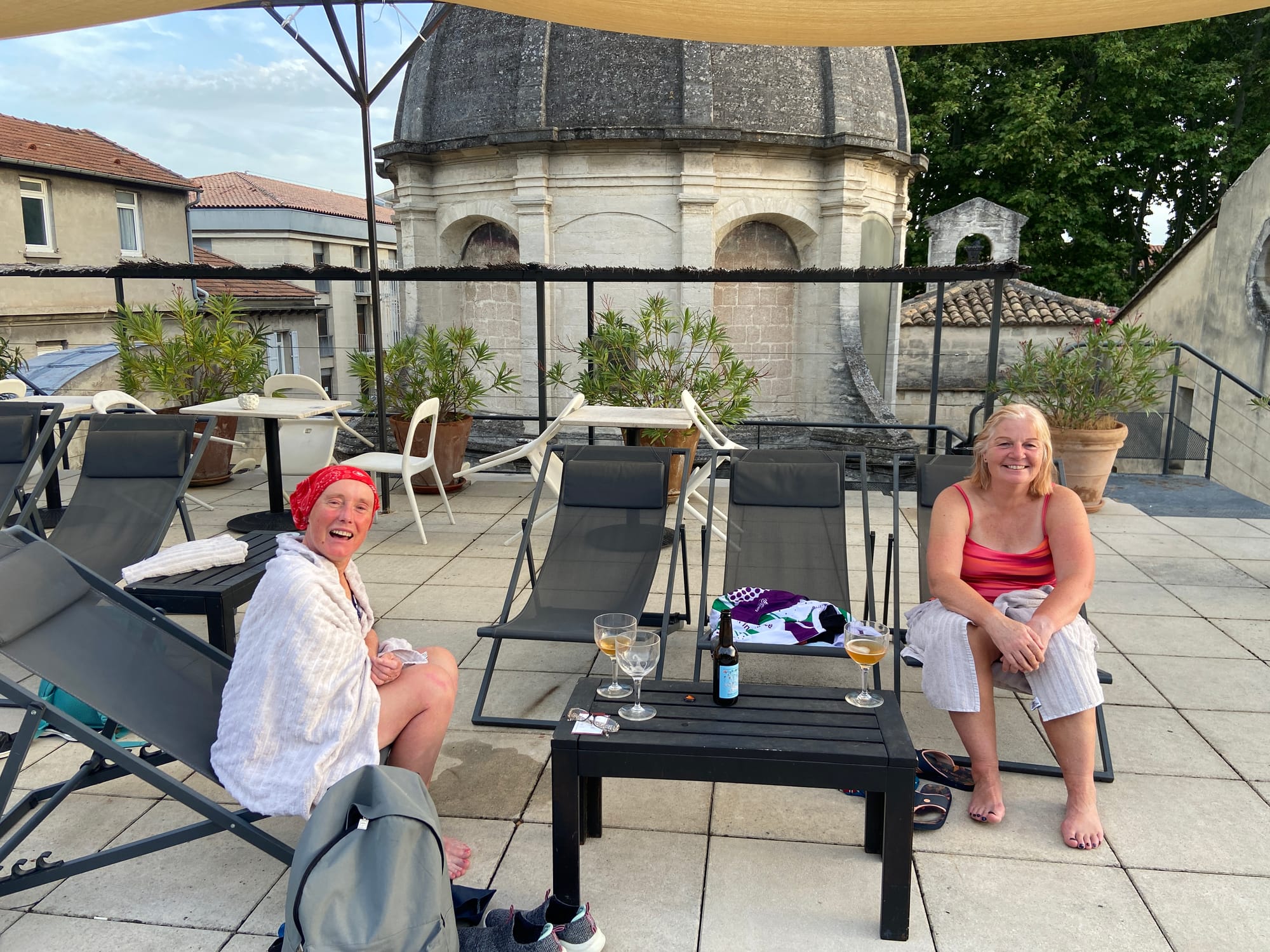 The city walls and the Rhône offered a first glimpse of Avignon’s charm, but there was neither time nor energy left for exploring. The only thing that appealed to our overheated bodies was a dip in the cold pool. We ordered a couple of beers and relaxed by the water until around 7 p.m.