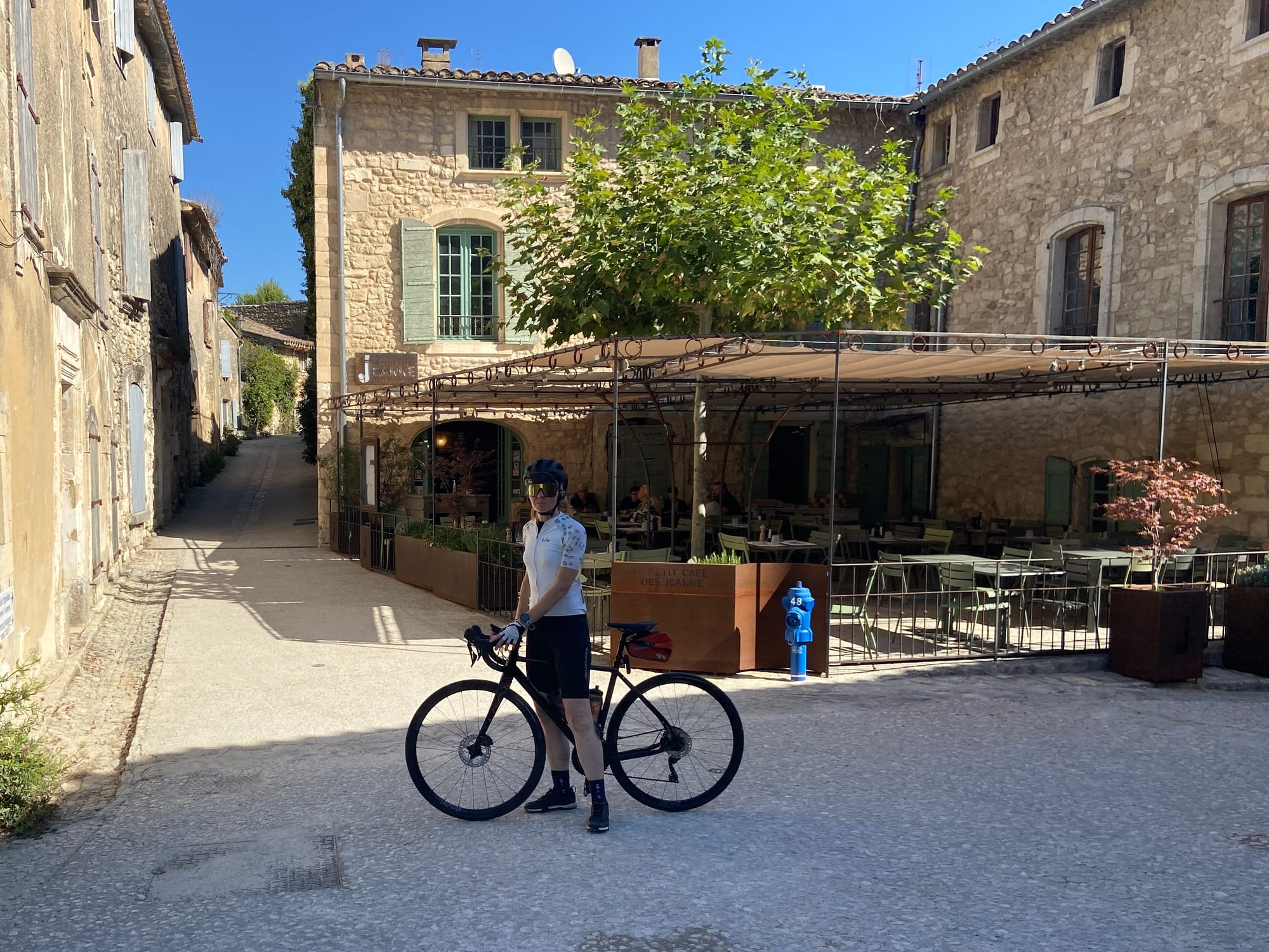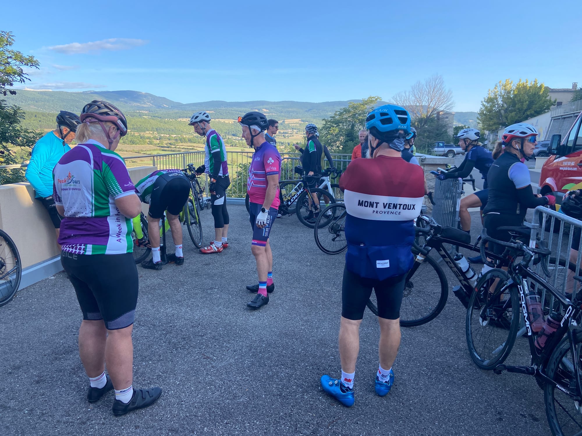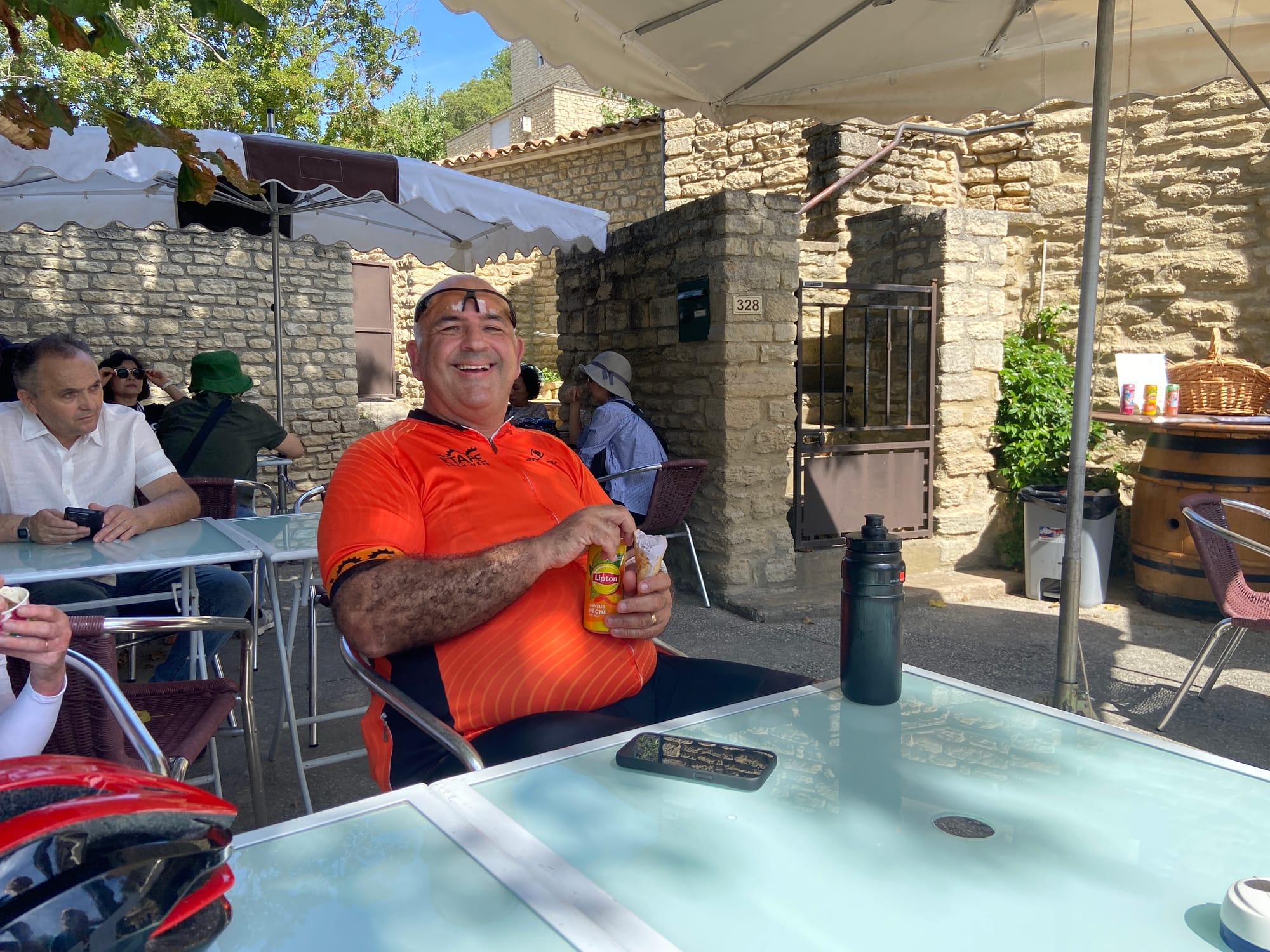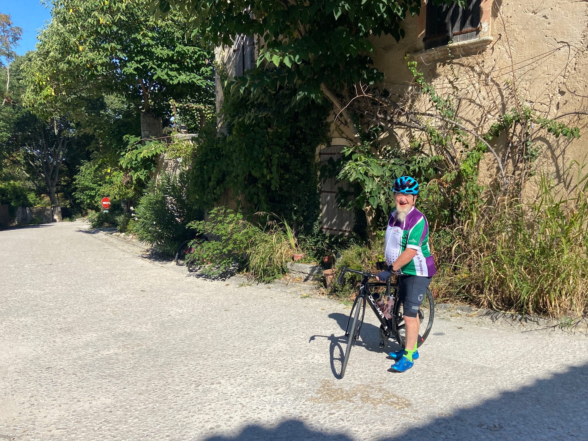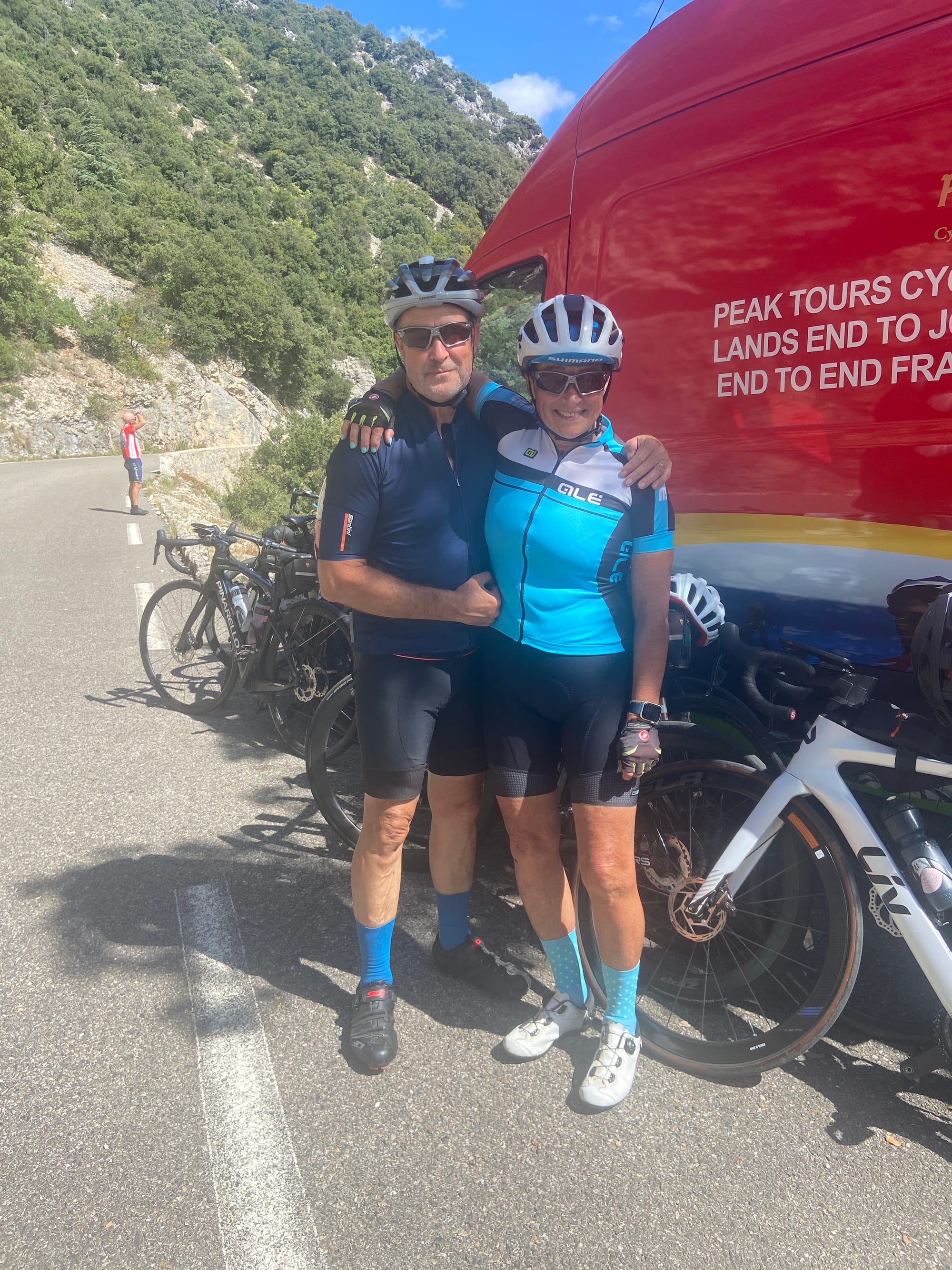 A huge thanks to Tony for arriving with my spare battery and, of course, taking the obligatory photos. The descent followed — thirteen miles of steep roads with plenty of bends — before reaching lunch in Bédoin.