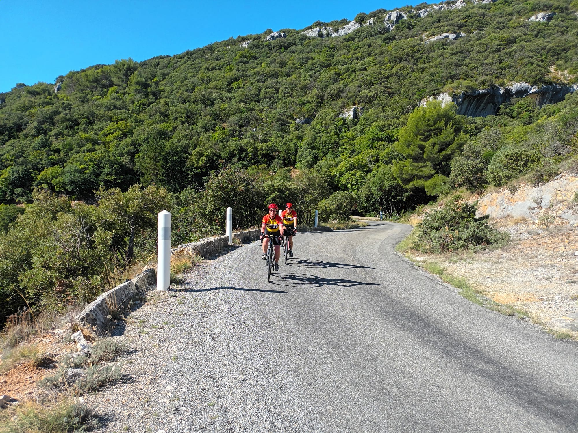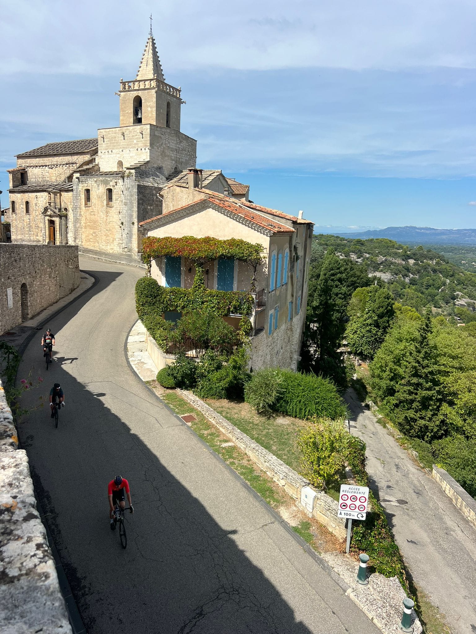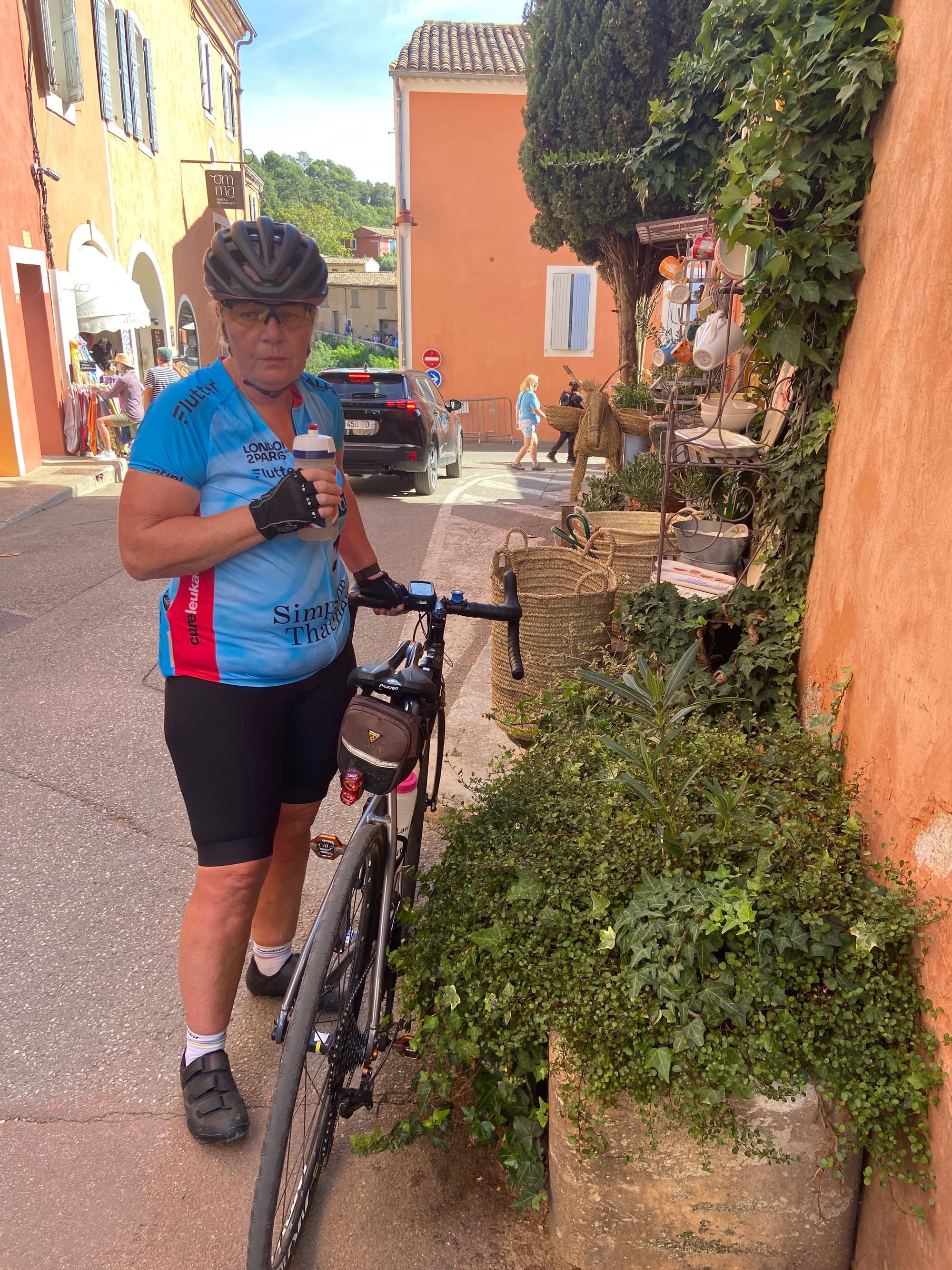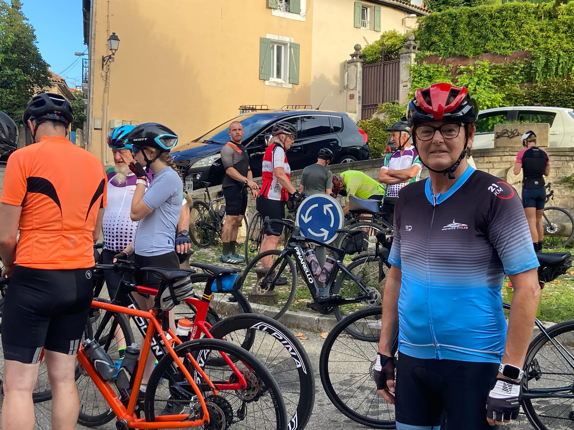 A huge thanks to Tony for arriving with my spare battery and, of course, taking the obligatory photos. The descent followed — thirteen miles of steep roads with plenty of bends — before reaching lunch in Bédoin.
