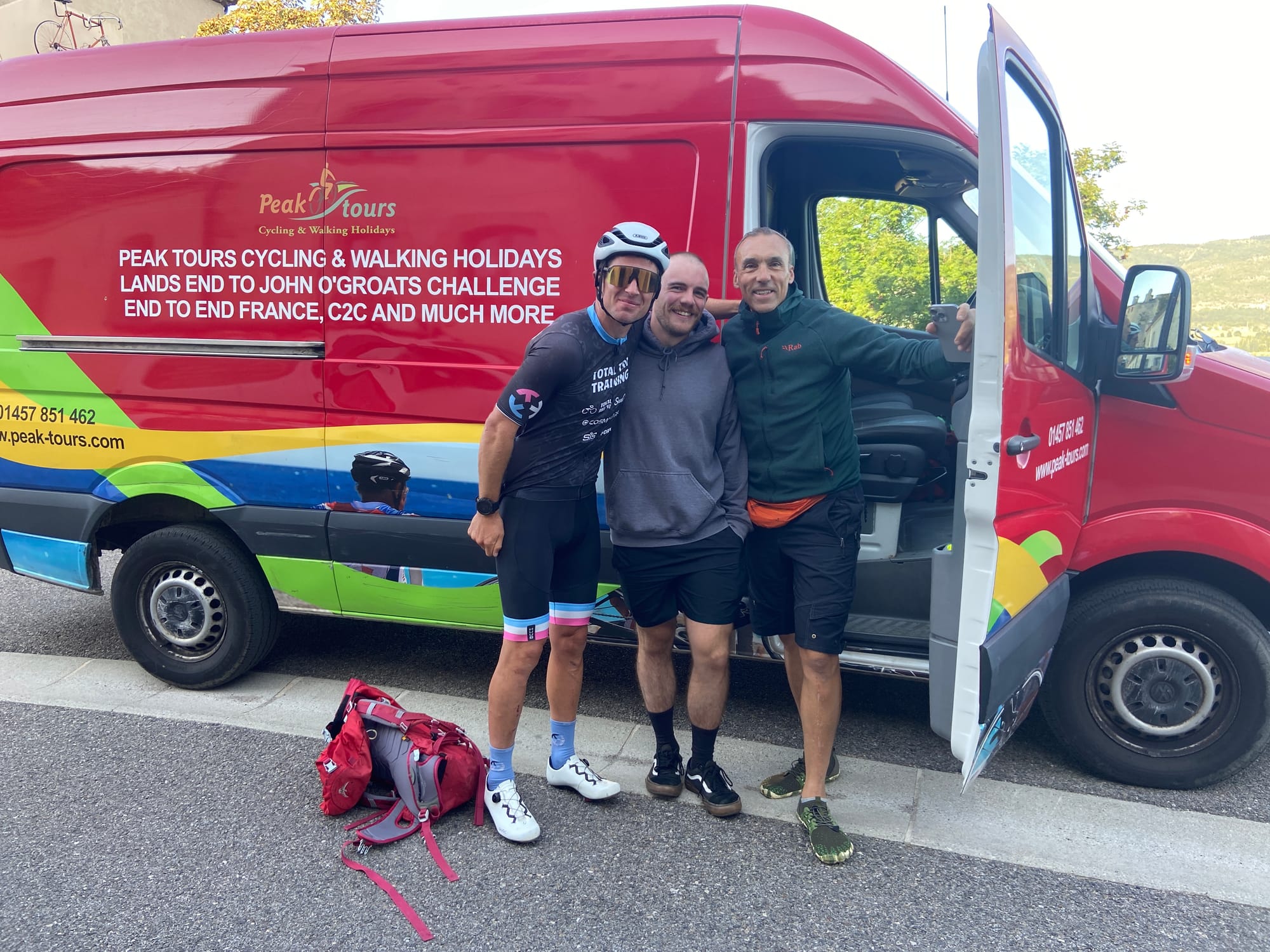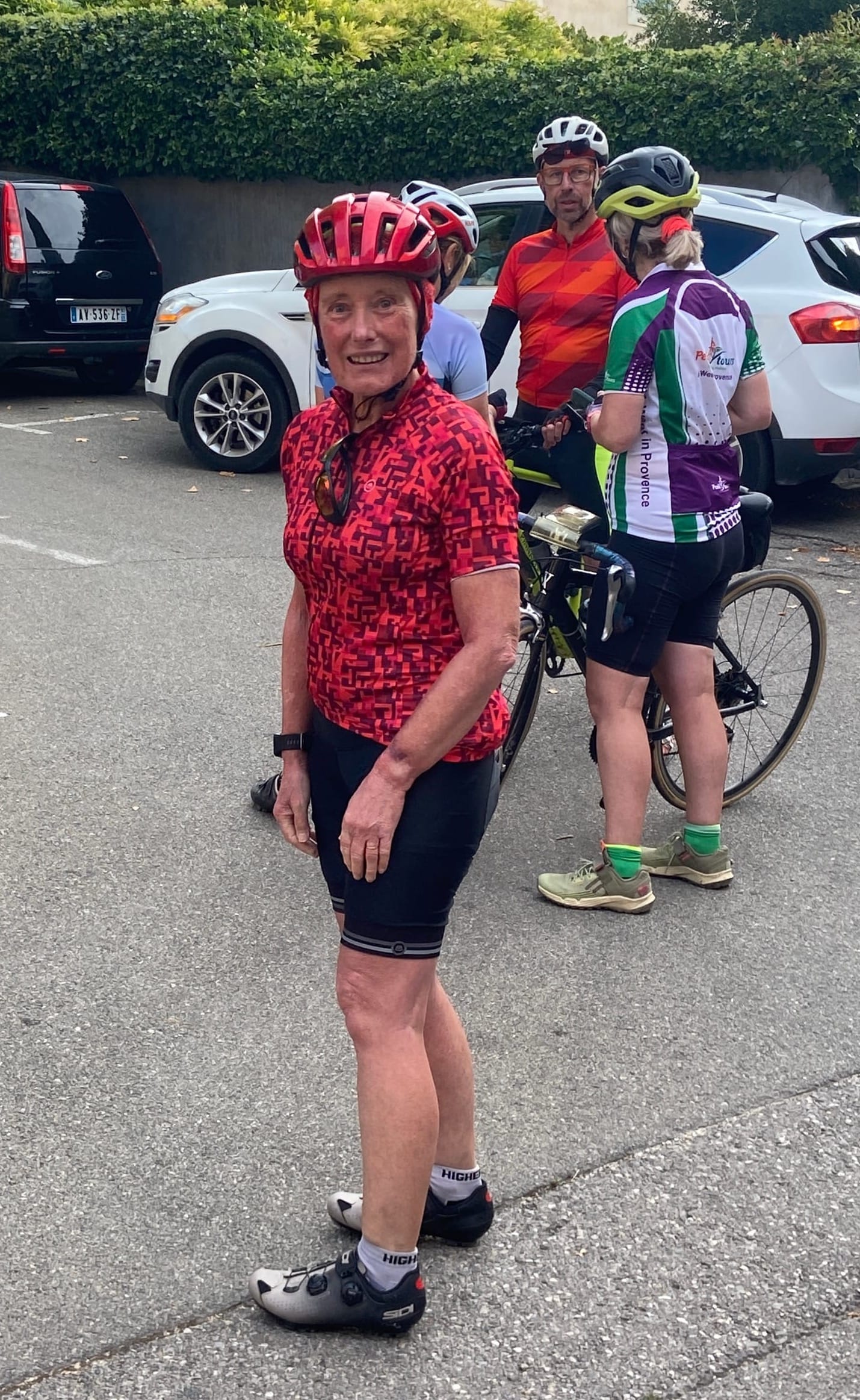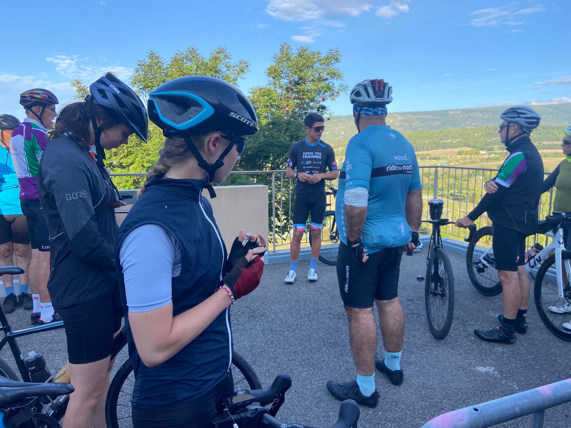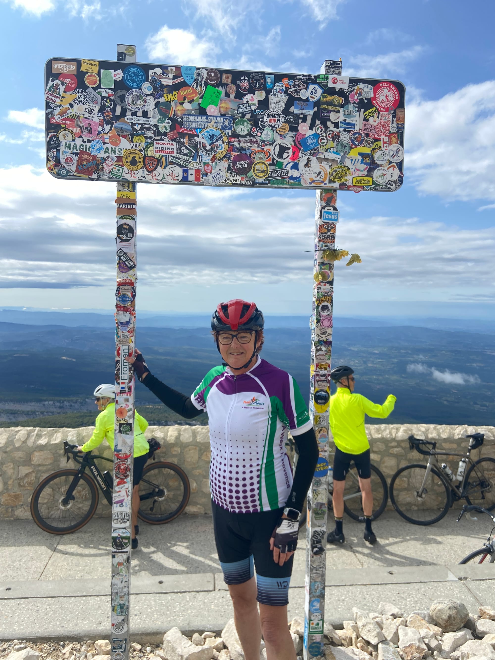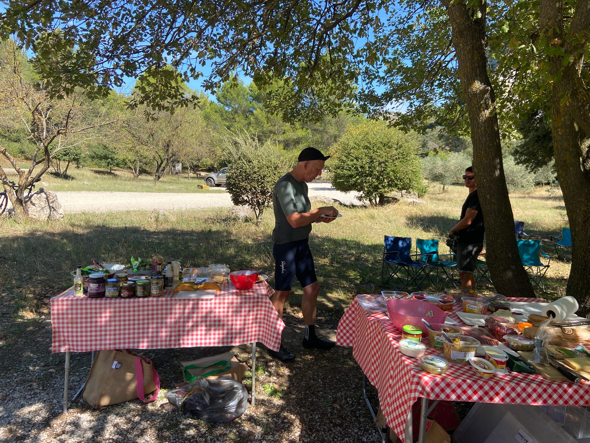 A huge thanks to Tony for arriving with my spare battery and, of course, taking the obligatory photos. The descent followed — thirteen miles of steep roads with plenty of bends — before reaching lunch in Bédoin.