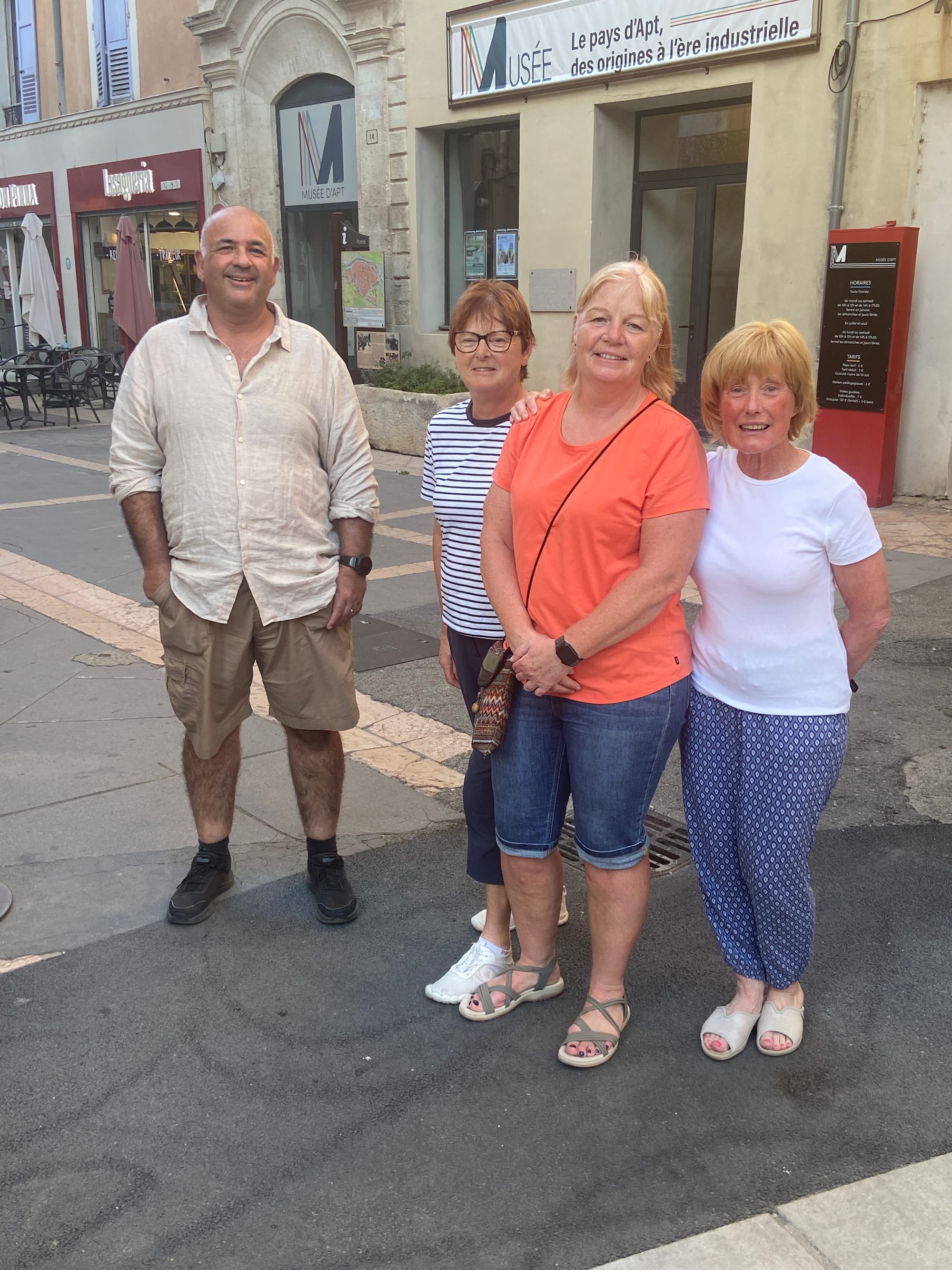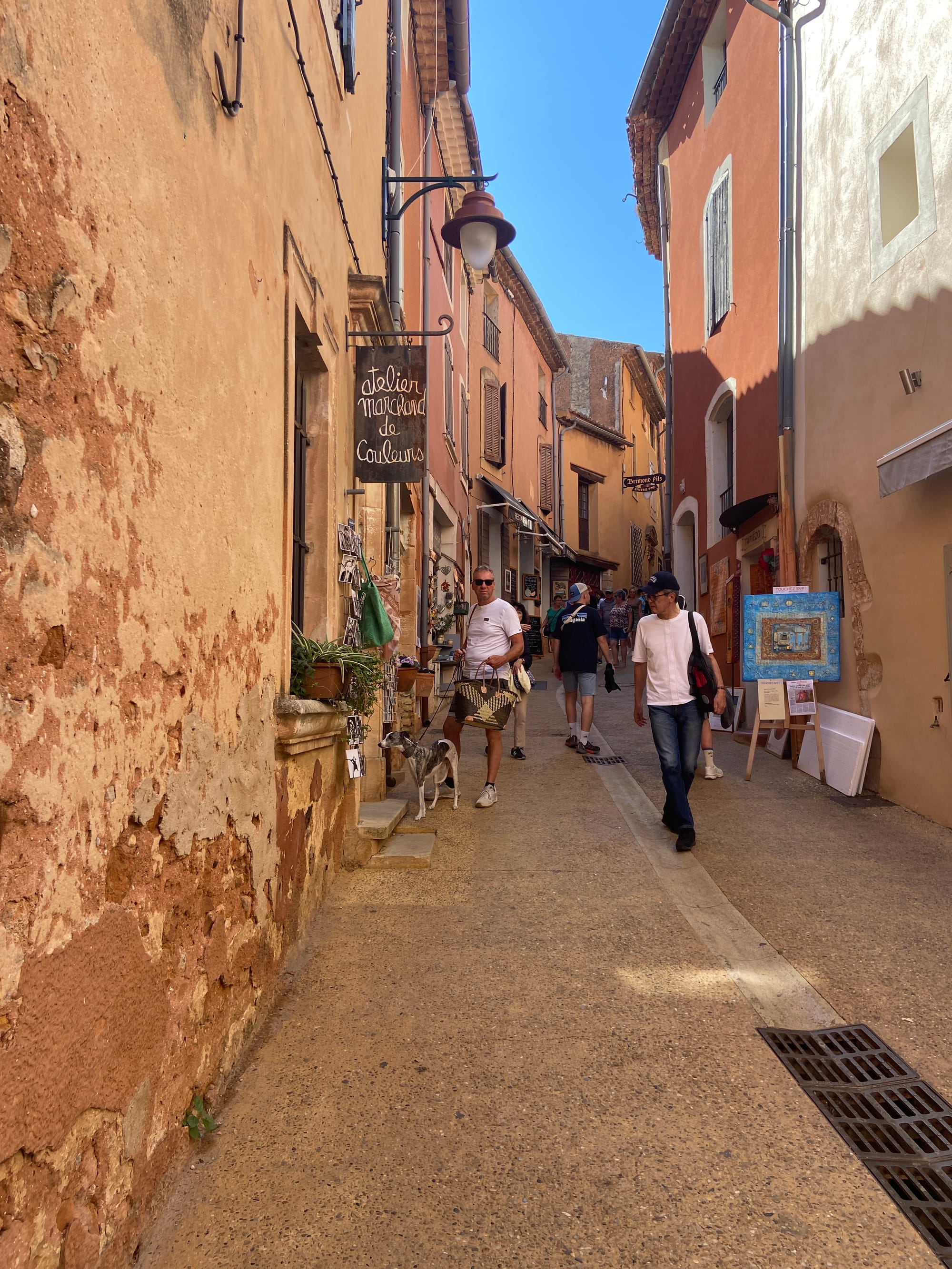 We passed through Le Thor, then the beautiful hilltop villages of Gordes and Roussillon, both buzzing with tourists drawn by their charm and views. By late afternoon we rolled into the sleepy little town of Apt, our base for the next two nights. The hotel was fabulous — a beautifully restored old house with high ceilings and elegant rooms. The best surprise was having separate rooms. We even tossed a card for the double bed — best of three — I won 2–0, no contest!