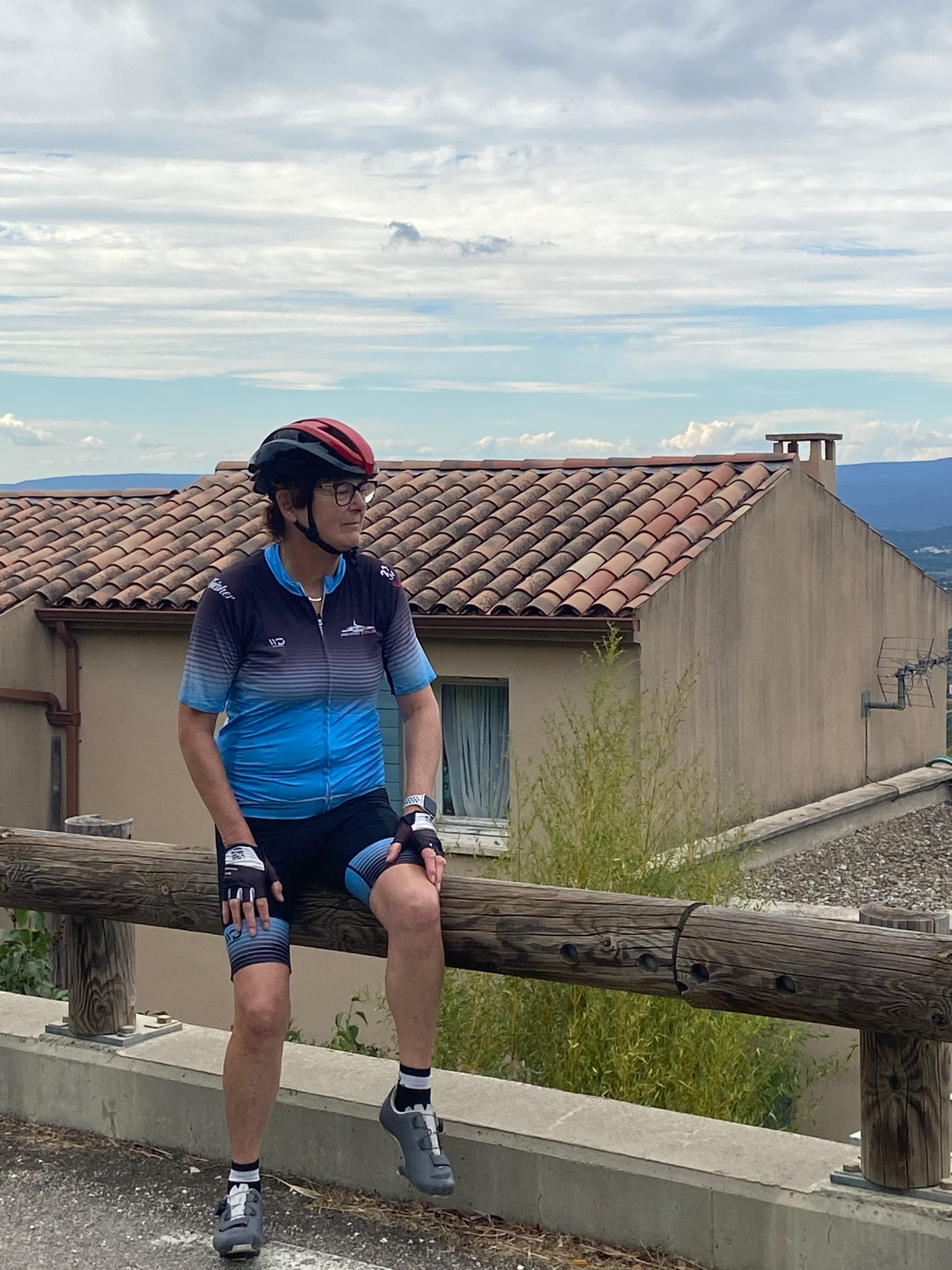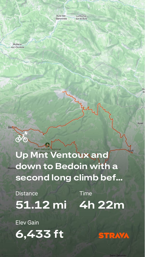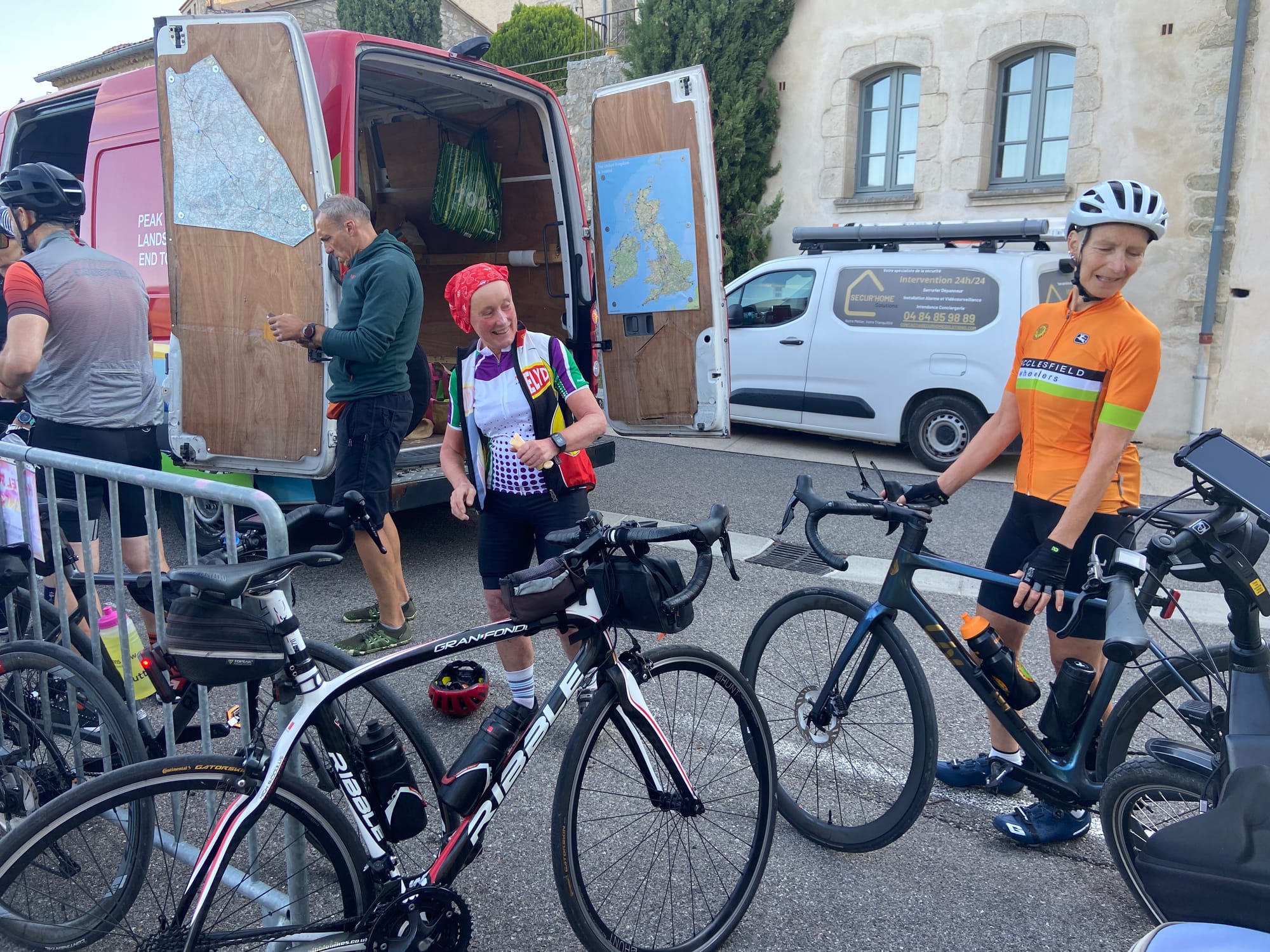 After lunch, it was straight into the next climb only another 2000 feet. OMG, it was surreal – we could see Ventoux to our left, getting closer and closer as we climbed. It was tough, overdressed from being so cold after coming down. Eventually, there was nothing for it but to stop, strip off, and rearrange the bags. Up, up, up again, and then there was the red van – such a welcome sight! Rehydrated and refuelled, it was a long flat road and then the most fantastic descent back into Sault.