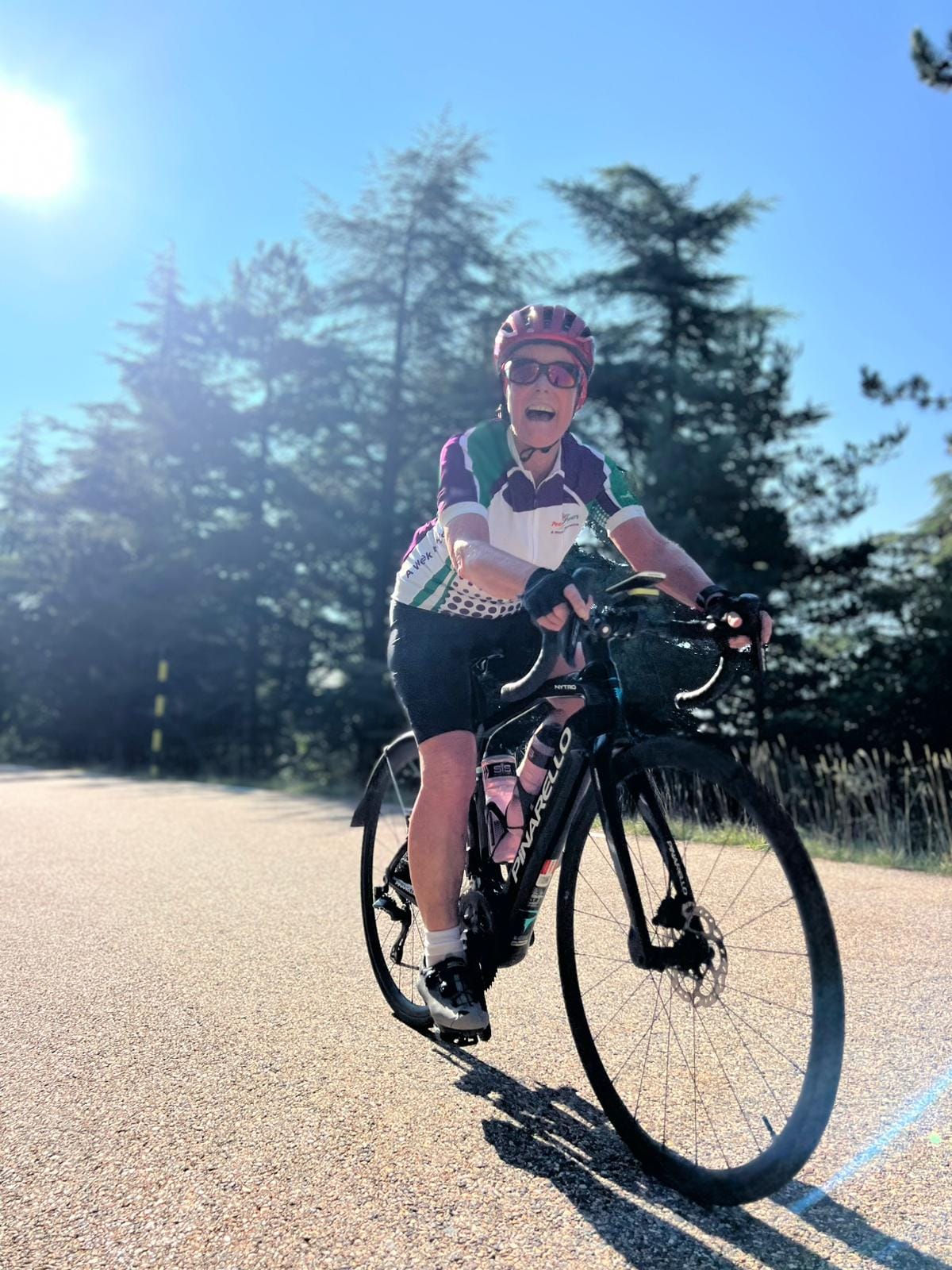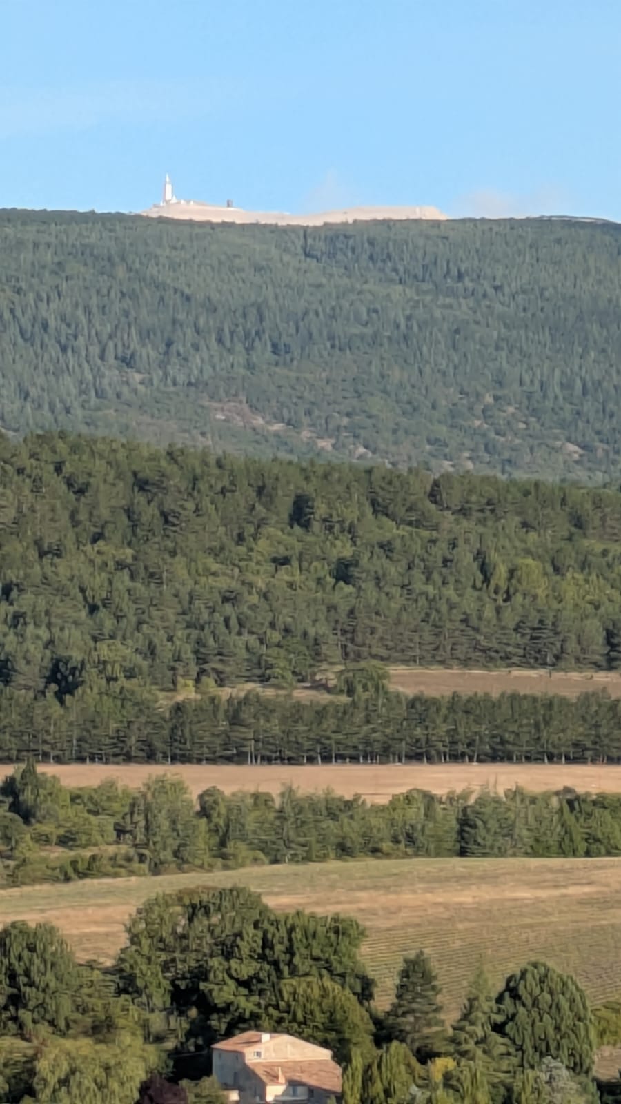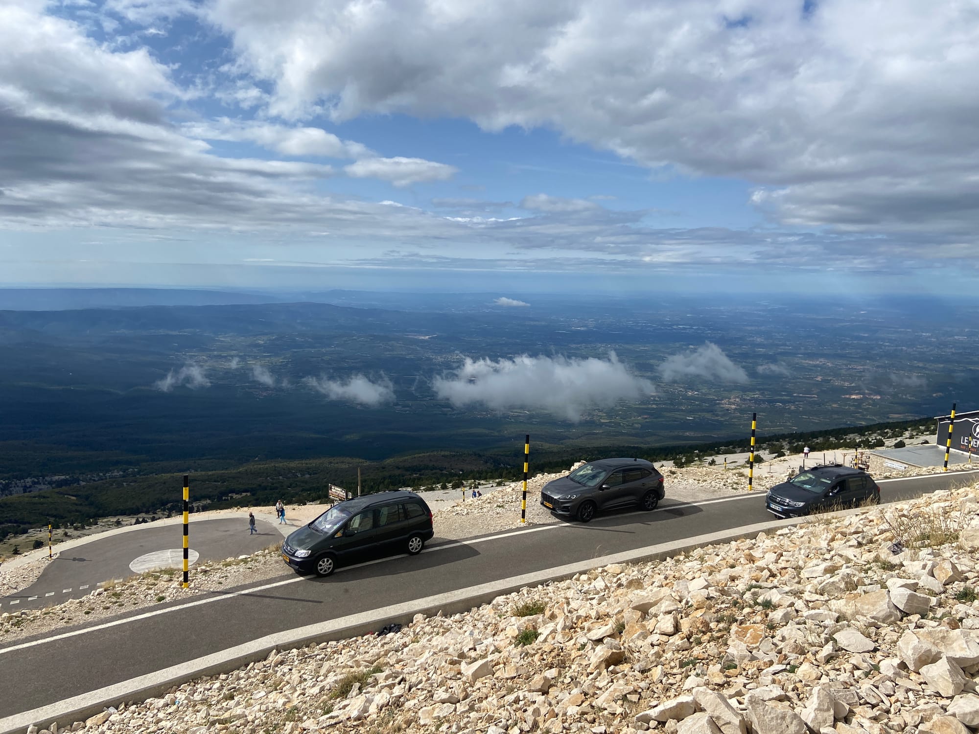 After lunch, it was straight into the next climb only another 2000 feet. OMG, it was surreal – we could see Ventoux to our left, getting closer and closer as we climbed. It was tough, overdressed from being so cold after coming down. Eventually, there was nothing for it but to stop, strip off, and rearrange the bags. Up, up, up again, and then there was the red van – such a welcome sight! Rehydrated and refuelled, it was a long flat road and then the most fantastic descent back into Sault.