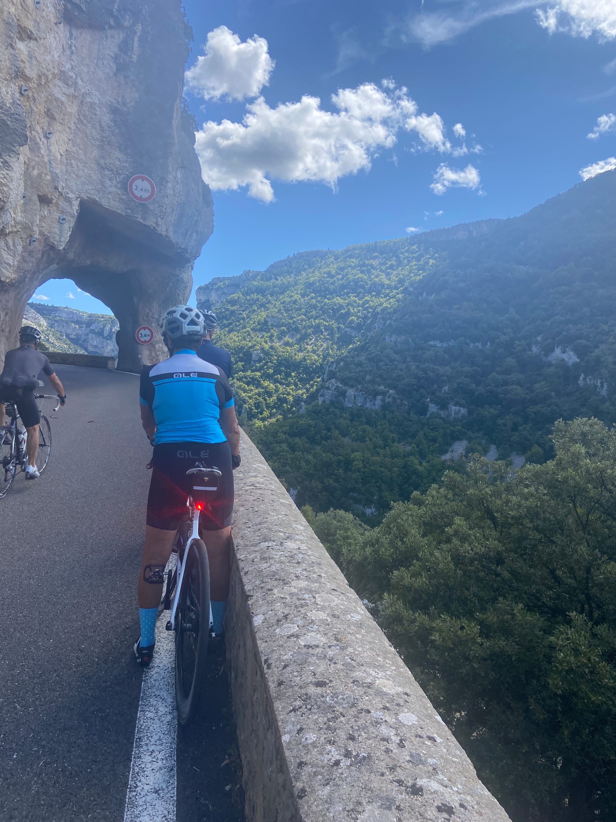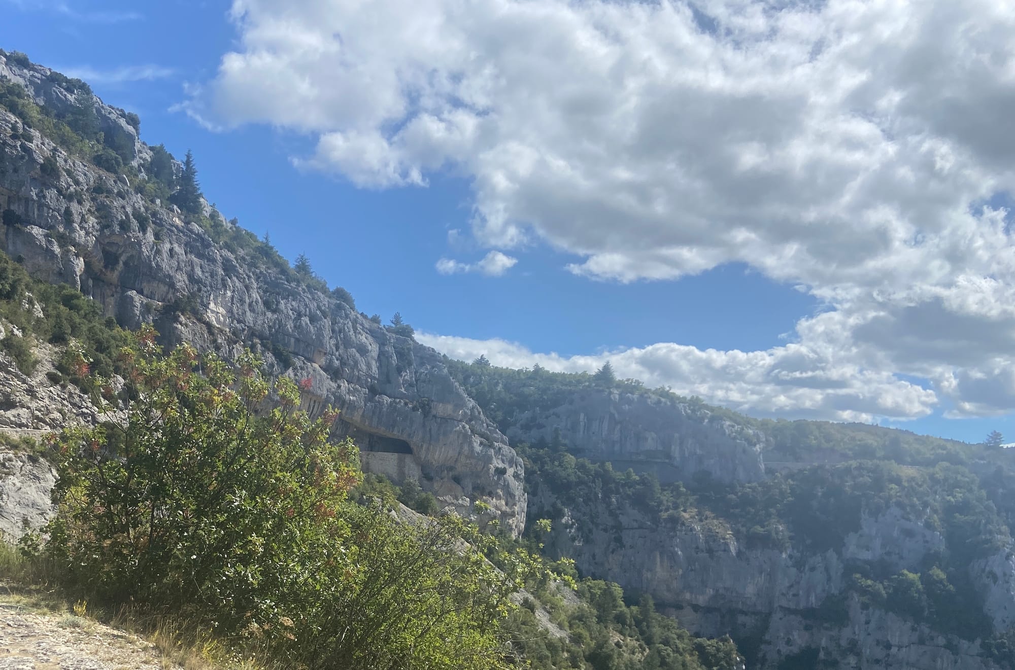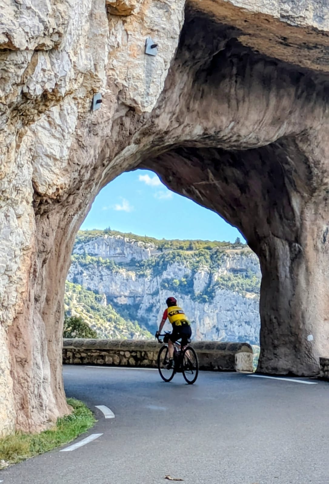 After lunch, it was straight into the next climb, not steep but up, up, all the way. This route took took us through the Gorges de Nesque, arguably the most spectacular gorge in Provence after the Gorges du Verdon. It was an incredibly scenic route that climbed gradually through this fabulous gorge revealing ever more spectacular views. Due to the many short but low tunnels along the road that clings to the cliff side, the route was gloriously free of traffic