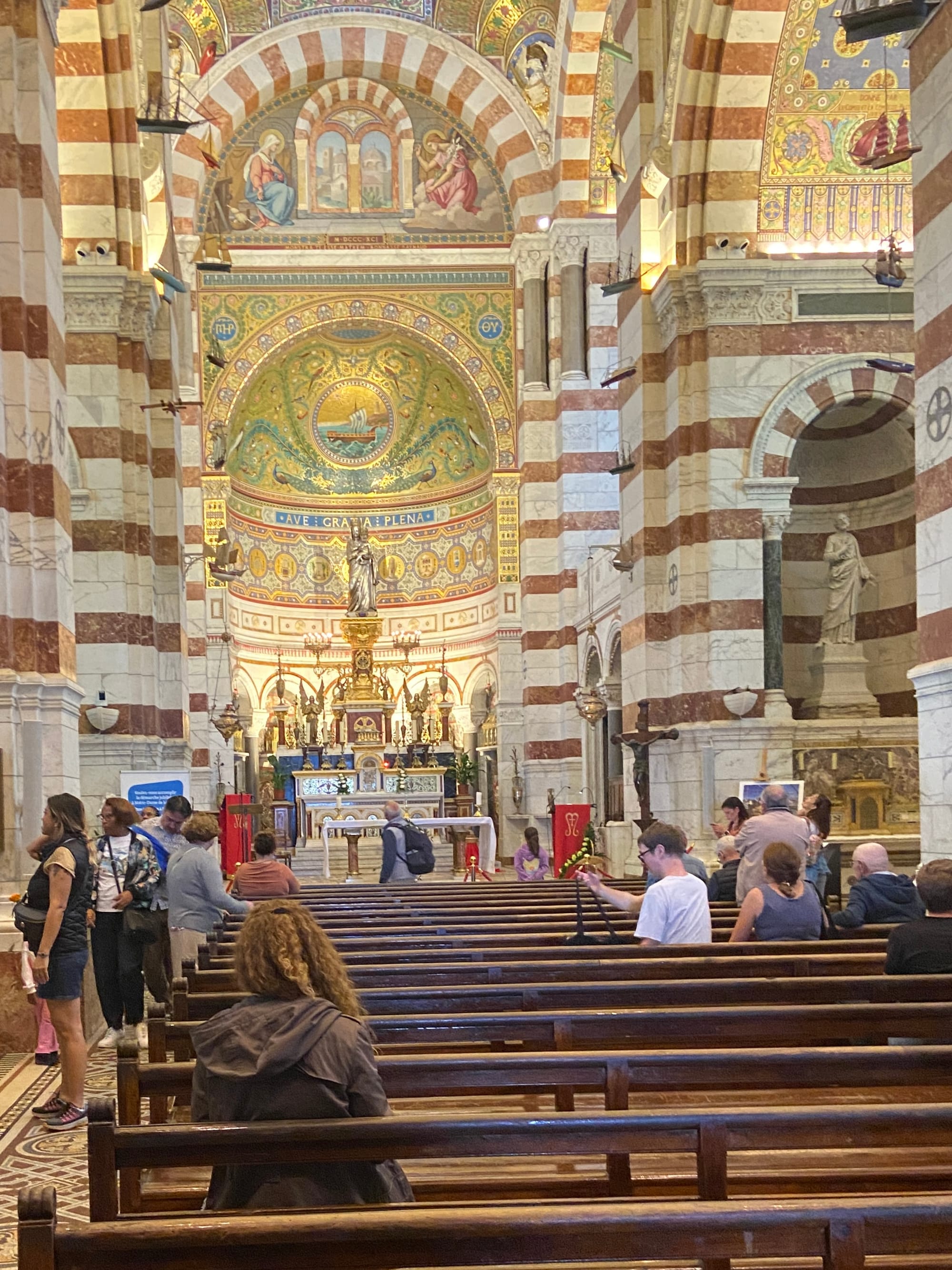 Our first stop was Notre-Dame de la Garde, after a scenic drive along the coast through historic streets with the audio narration playing. The journey was fascinating, but the visit itself was a bit of a letdown — by the time we located the main area, Mass was about to start, so we barely had five minutes inside to take it all in.