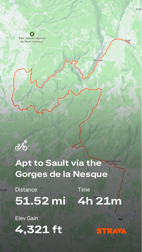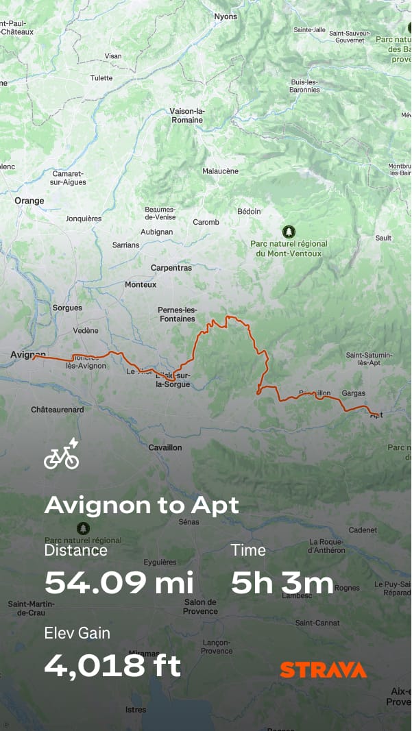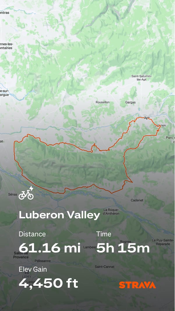 What a day — one of the best cycling days ever! After leaving Apt, we quickly started climbing on smooth tarmac, rewarded almost immediately with stunning views across the valley floor. The route meandered through picturesque hilltop villages, each requiring a steep climb followed by an equally thrilling descent.