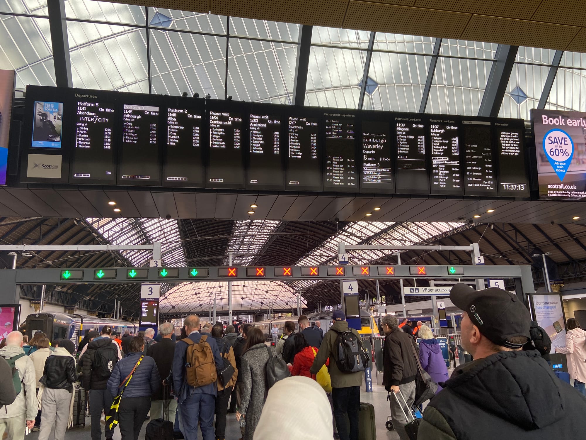 The train south rolled through green fields and along glimpses of coastline. We changed at Haymarket to avoid the busy Edinburgh Waverley, though there was a brief moment of confusion when the connecting train didn’t stop where we expected. Thankfully, it all worked out in the end, and before long we were comfortably on our way south again.
