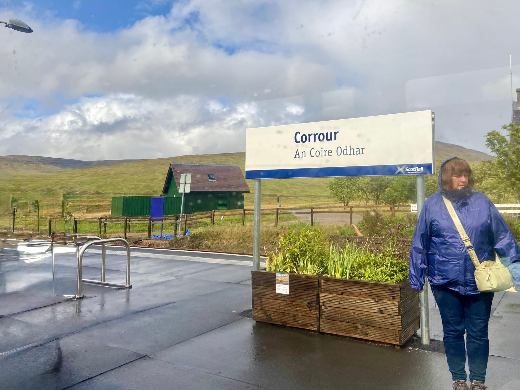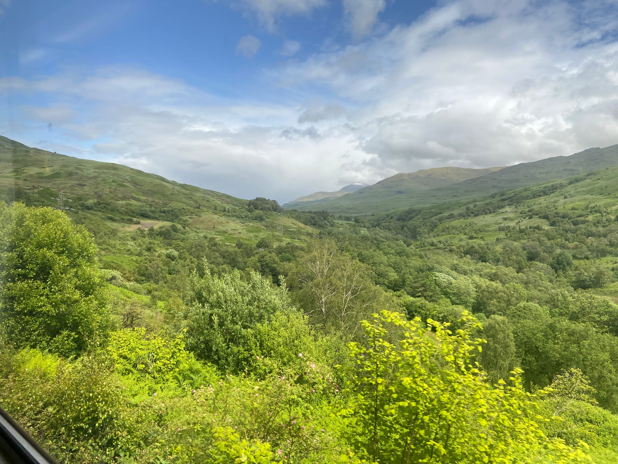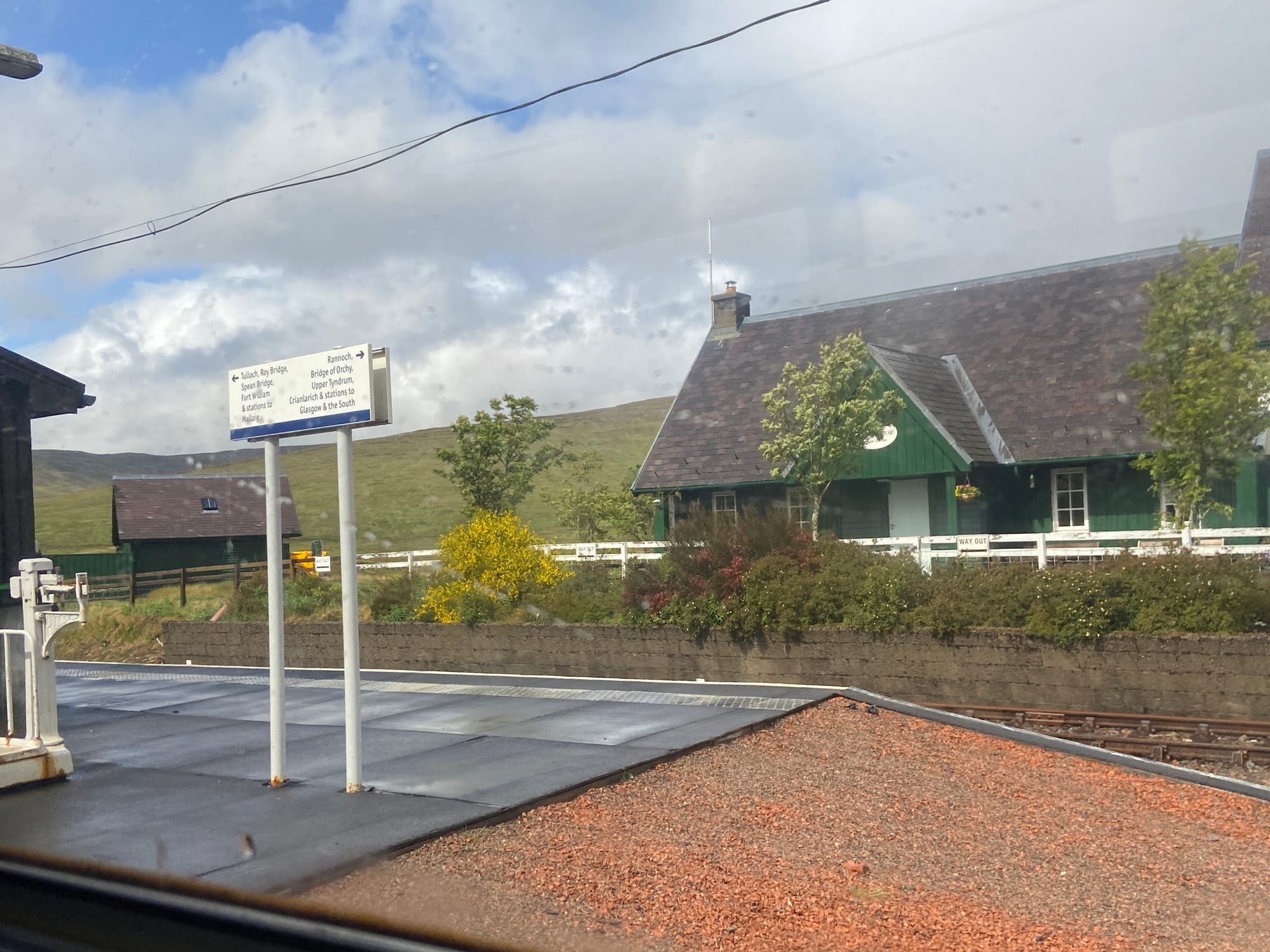 The change between stations in Glasgow went smoothly, and soon I was on the last leg of the journey. After leaving the city, the line narrowed to single track and the pace slowed, winding through some of the most beautiful scenery I’d ever seen. Even under rain-streaked skies, the Highlands were breathtaking—green slopes dropping into shadowed glens and lochs glimmering through the mist. Somewhere beyond Crianlarich the clouds lifted for a moment, revealing a hint of sunlight on distant hills — a glimpse of the wild country ahead.