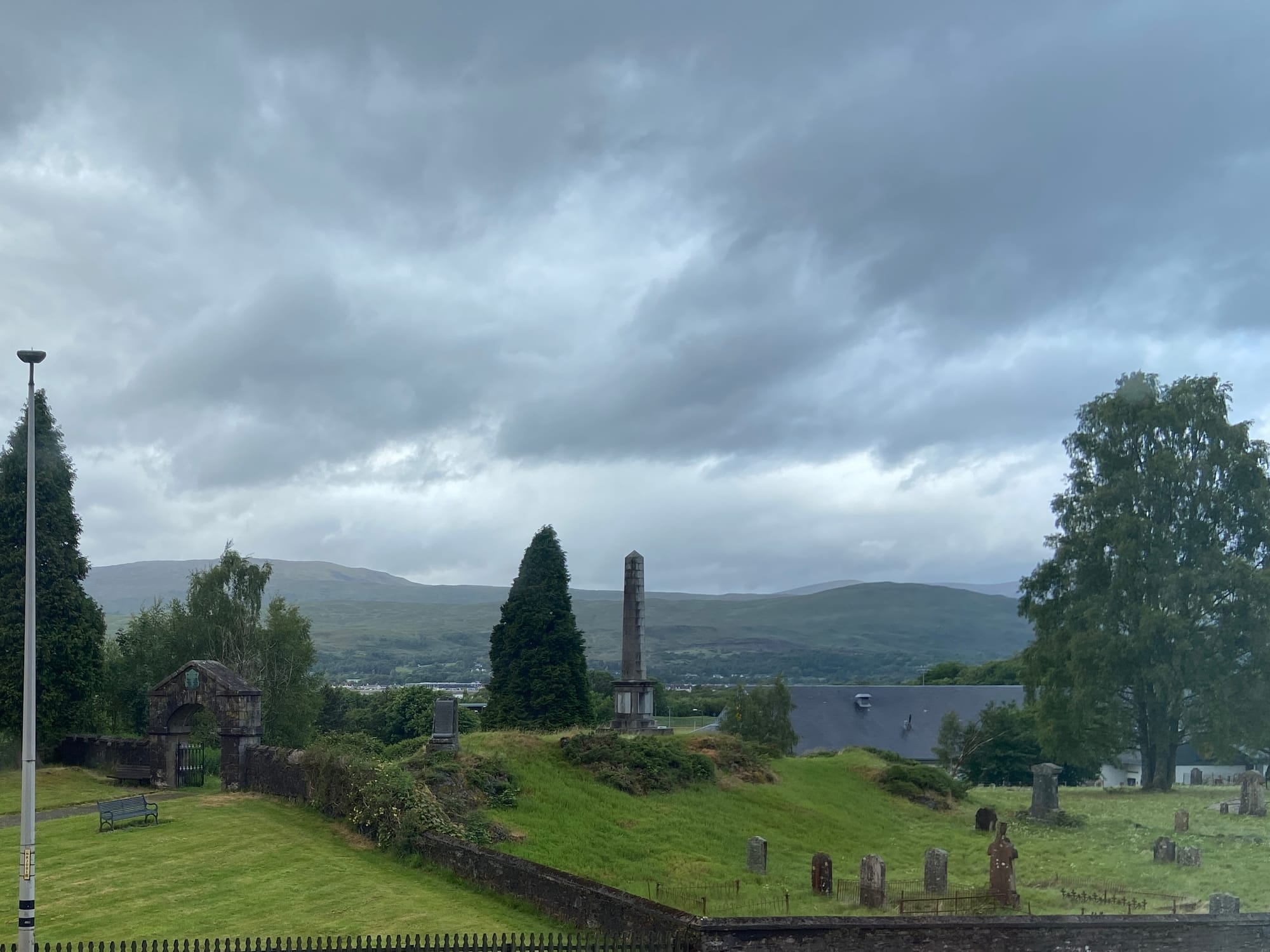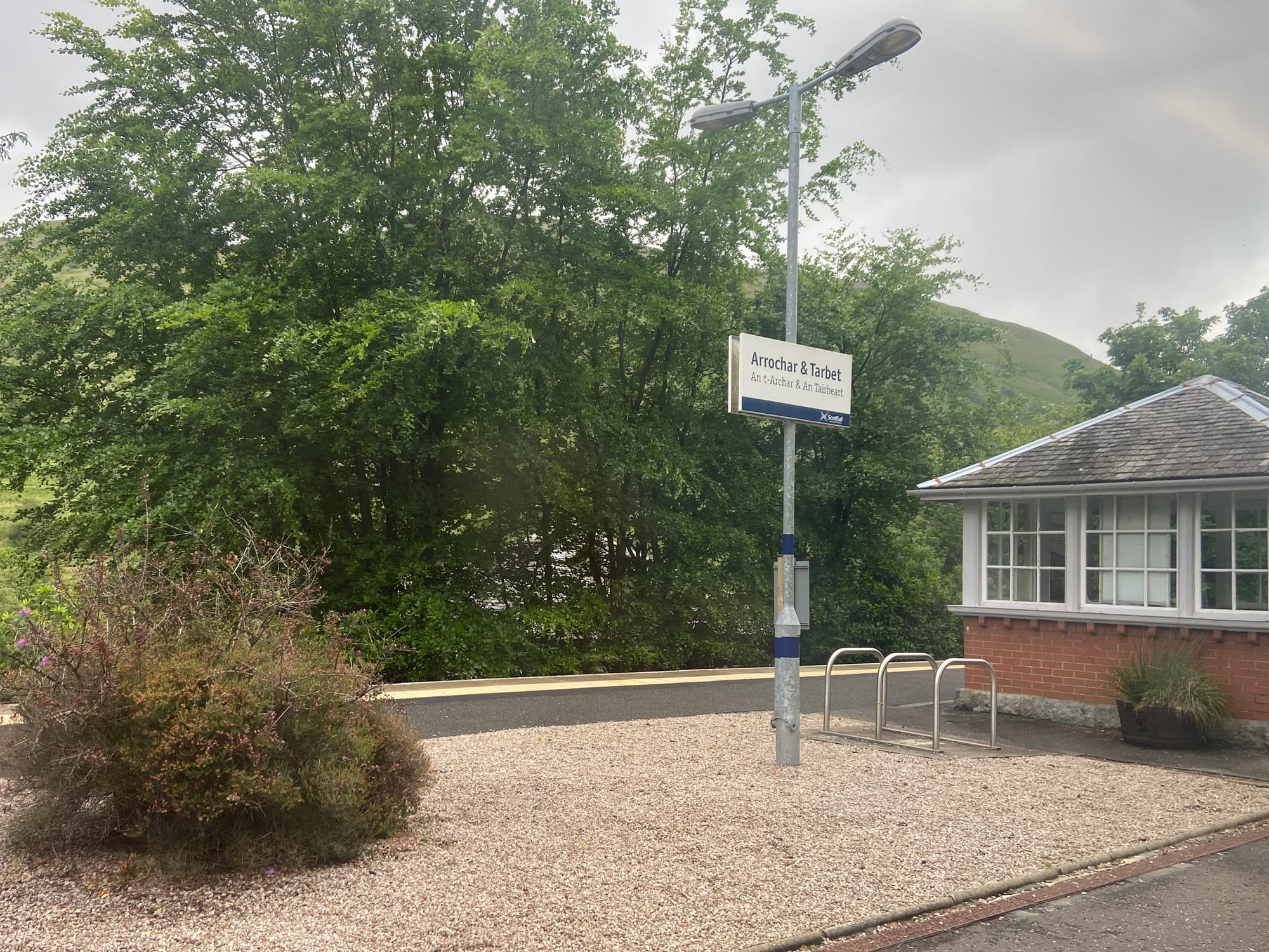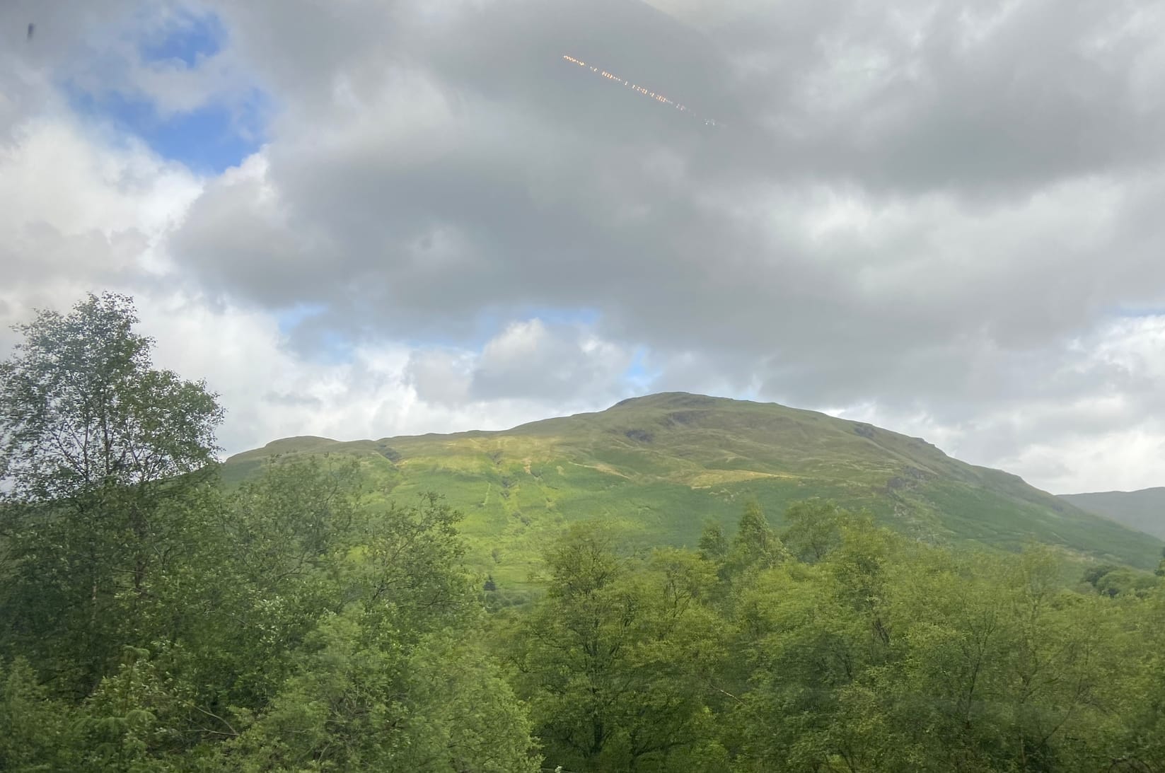 The change between stations in Glasgow went smoothly, and soon I was on the last leg of the journey. After leaving the city, the line narrowed to single track and the pace slowed, winding through some of the most beautiful scenery I’d ever seen. Even under rain-streaked skies, the Highlands were breathtaking—green slopes dropping into shadowed glens and lochs glimmering through the mist. Somewhere beyond Crianlarich the clouds lifted for a moment, revealing a hint of sunlight on distant hills — a glimpse of the wild country ahead.