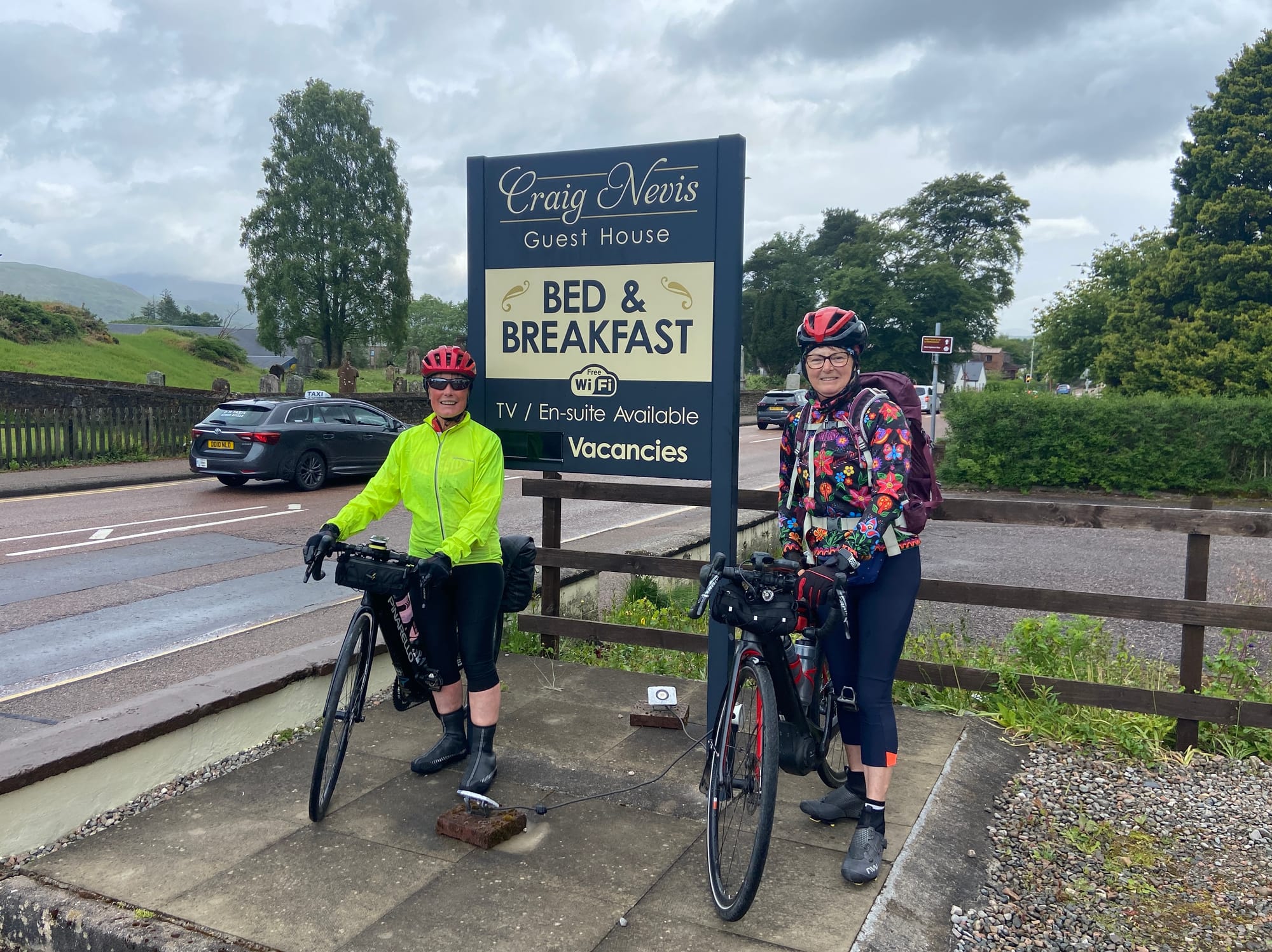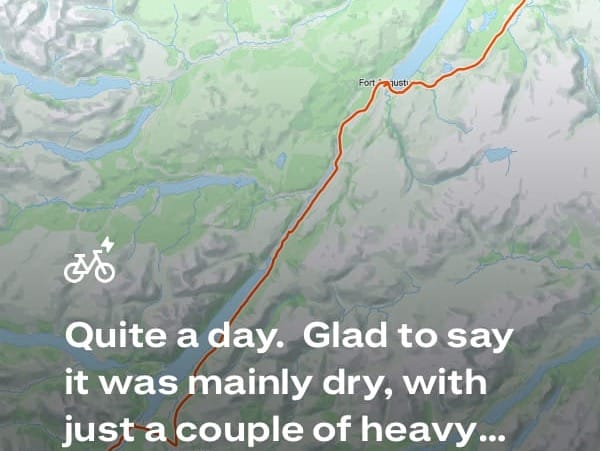 By the time I reached Fort William it was raining hard again, grey and relentless. I found the B&B with only one brief wrong turn and arrived first; Liz was still finishing her day’s cycling. She appeared not long after, drenched but cheerful, peeling off her wet layers—each one wrapped in its own carrier or bin bag in a valiant attempt to stay dry. She looked remarkably well, considering the miles behind her and the weather she’d battled through.We walked to a nearby hotel for dinner. The food was surprisingly good, and over a glass of wine the nerves and rain both felt far away. By the time we returned to our rooms, the rain had softened to a steady rhythm on the window. As I drifted off, it no longer sounded like a warning, but an invitation—the Highlands calling..