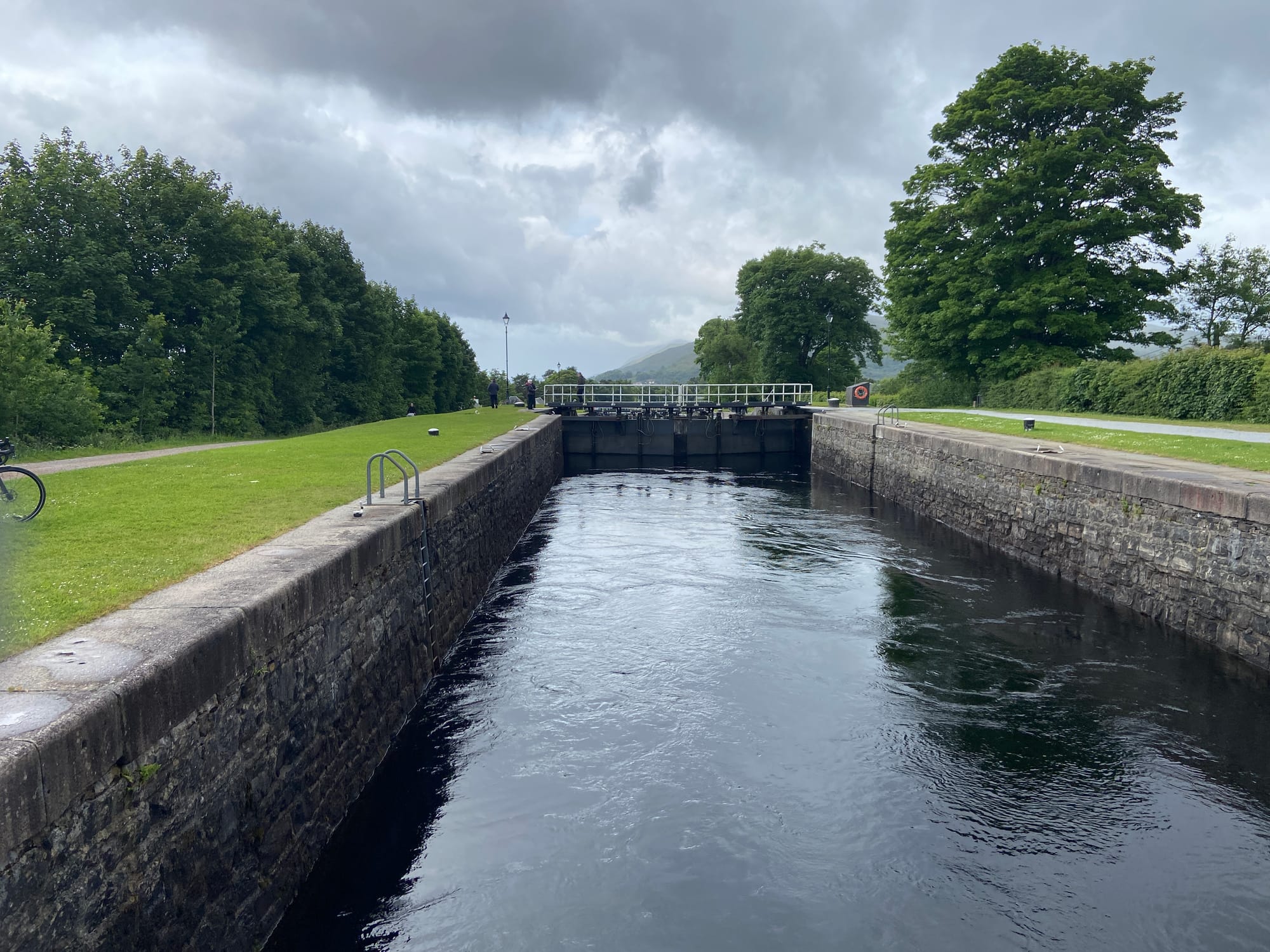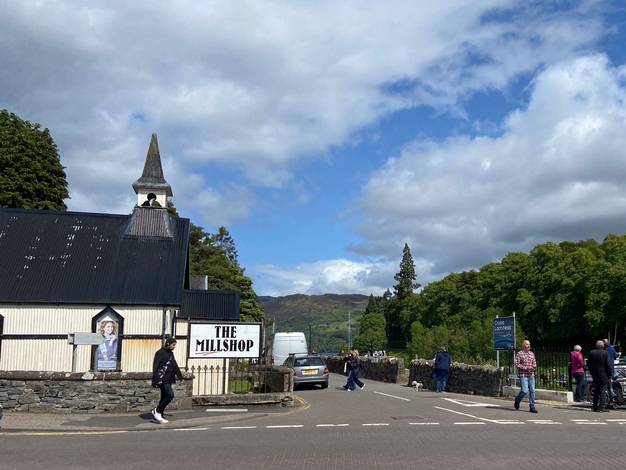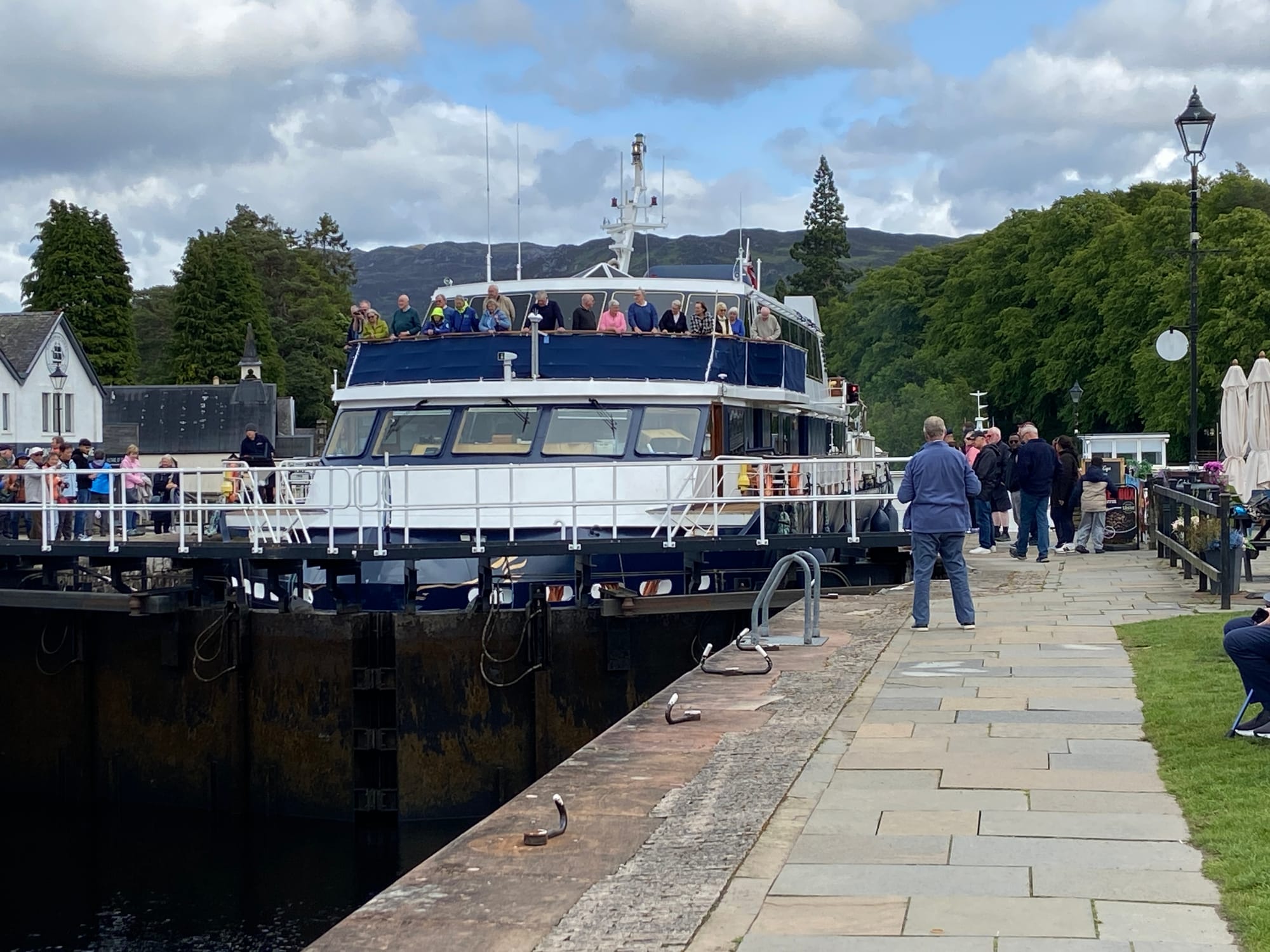 We eventually rolled into Fort Augustus, a lively little village at the southern tip of Loch Ness. The canal runs right through the centre, with cafés, walkers, and cyclists gathered to watch the locks in action. A huge tour boat was making its way through just as we arrived — it barely squeezed through, drawing quite a crowd.