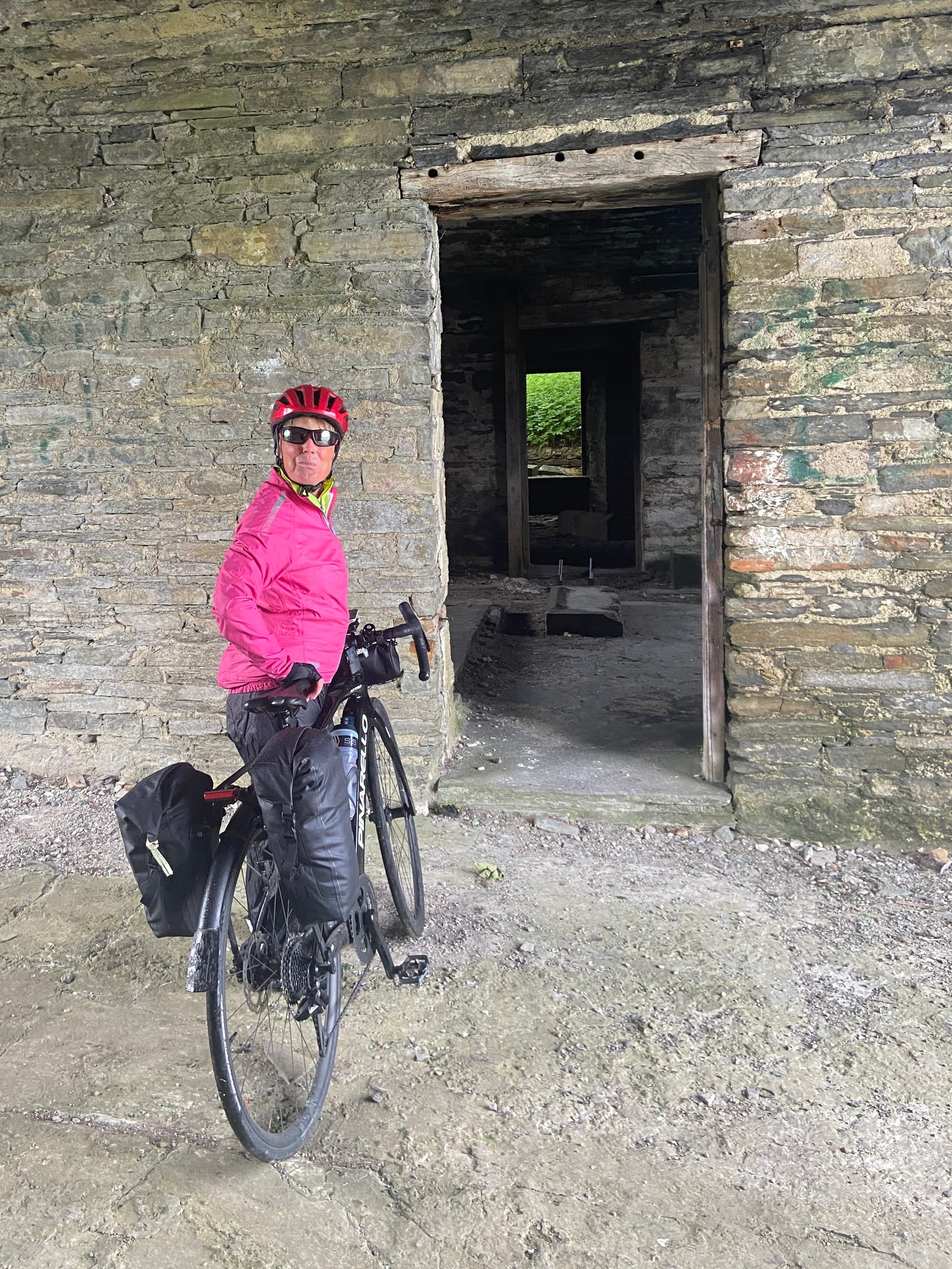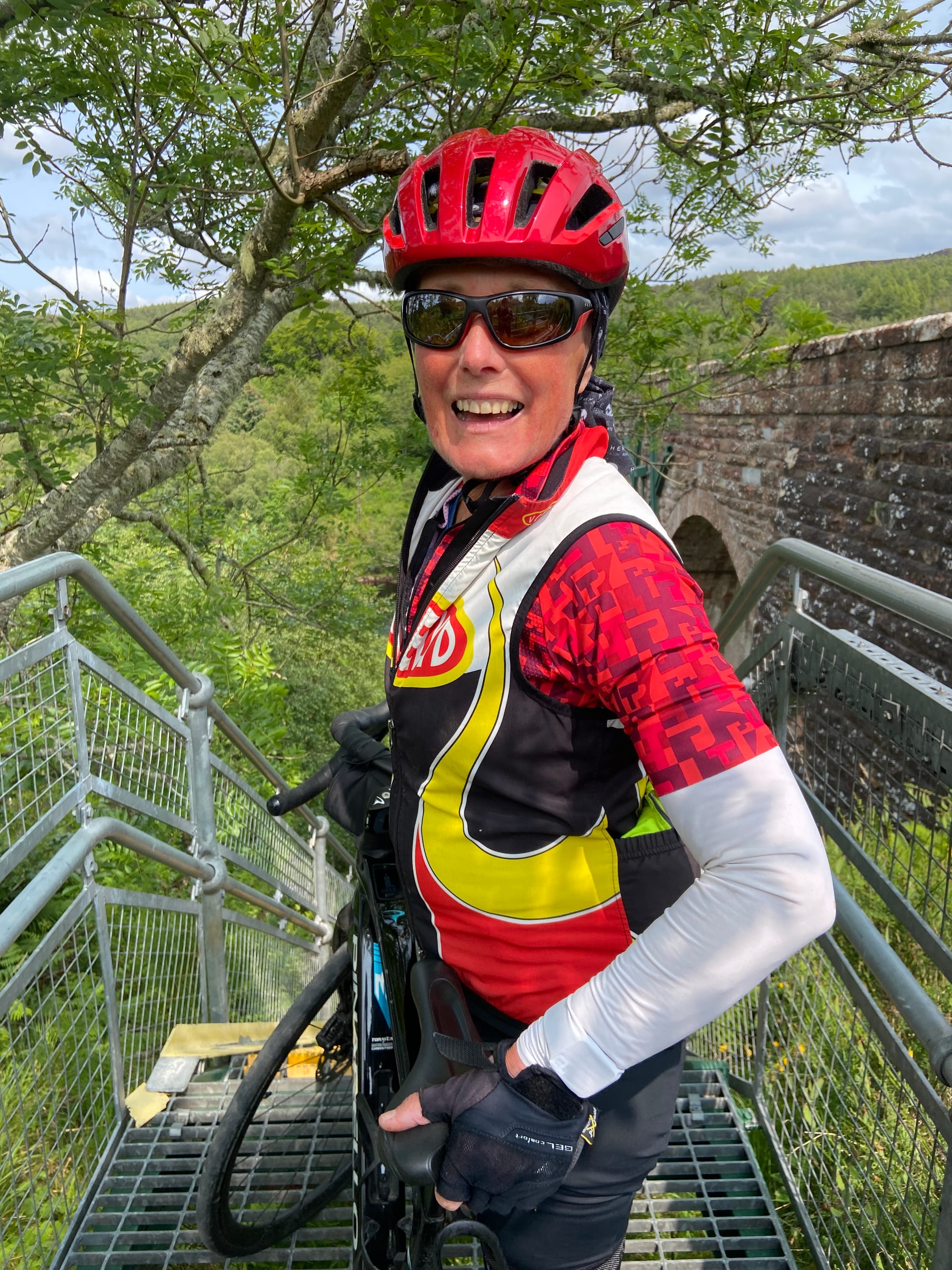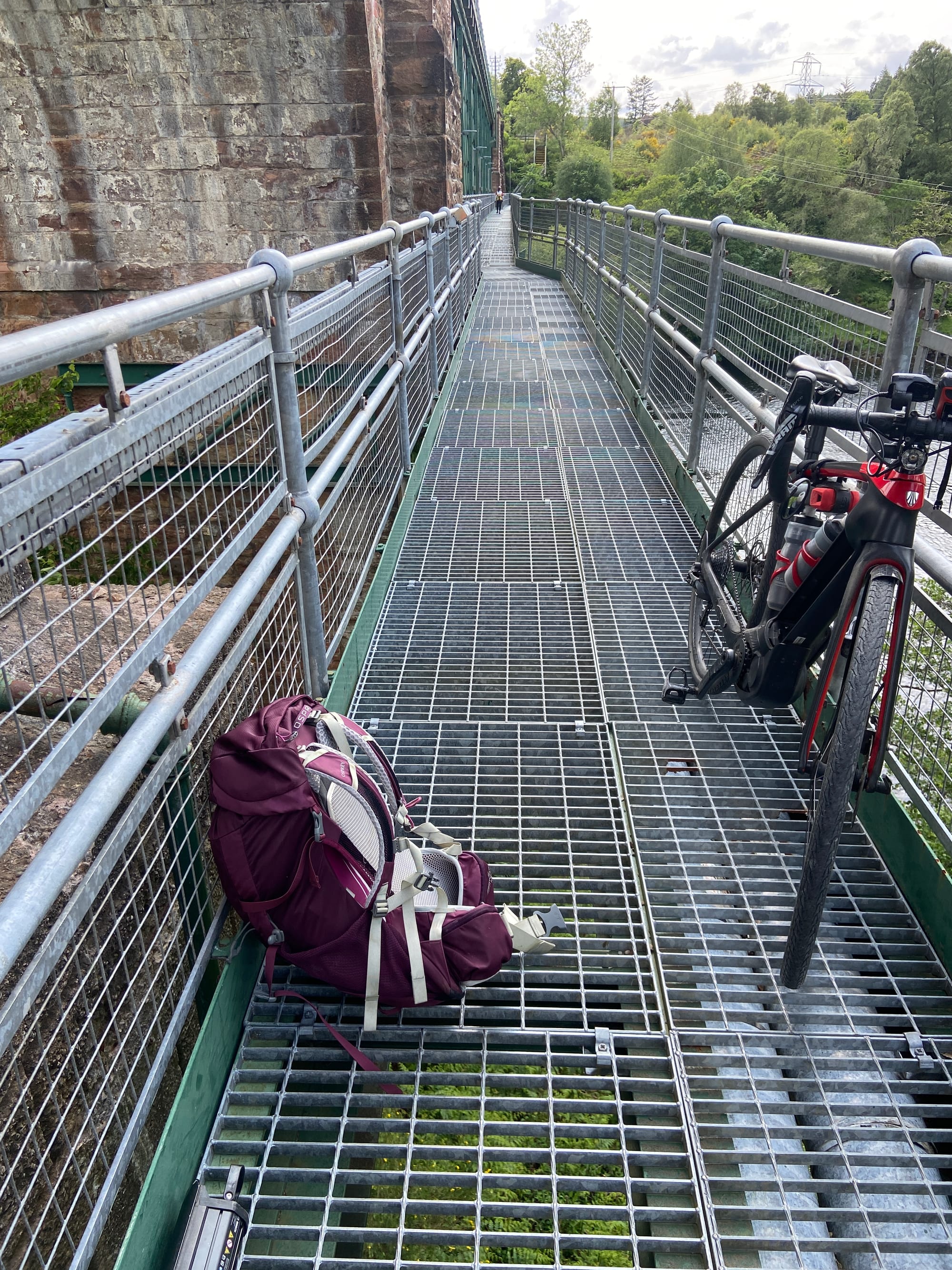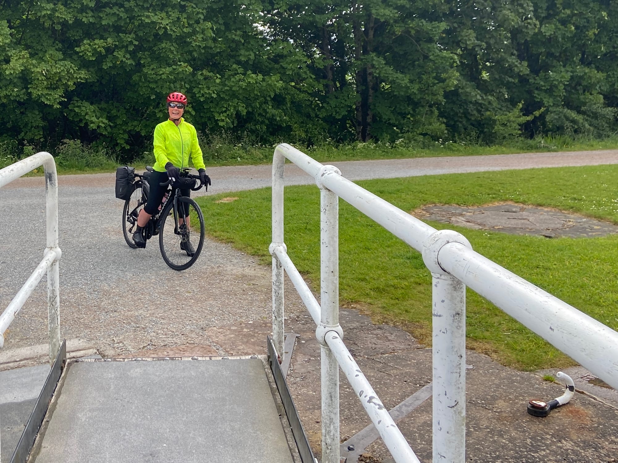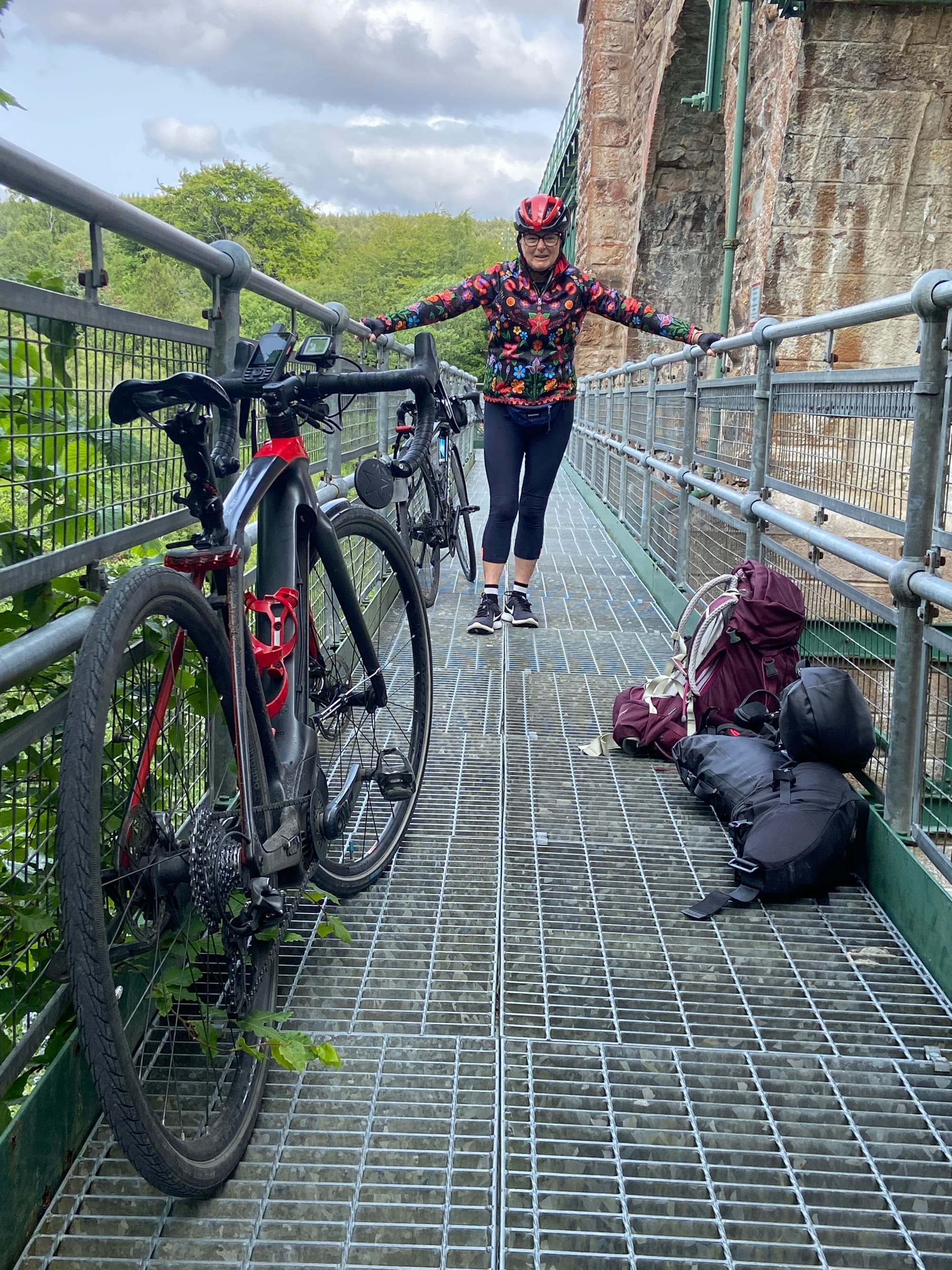 What had started as a perfectly normal cycle route suddenly turned into something far more adventurous: three very steep flights of steps, a narrow metal walkway across the river, and yet more stairs on the other side to rejoin the road. After checking for alternatives, it was clear there was only one option. We unpacked everything from the bikes to reduce the weight, changed out of our cycling shoes, and began the delicate task of manhandling them down the steps — a real team effort, helped by a small groove on the left, just wide enough for bike wheels.