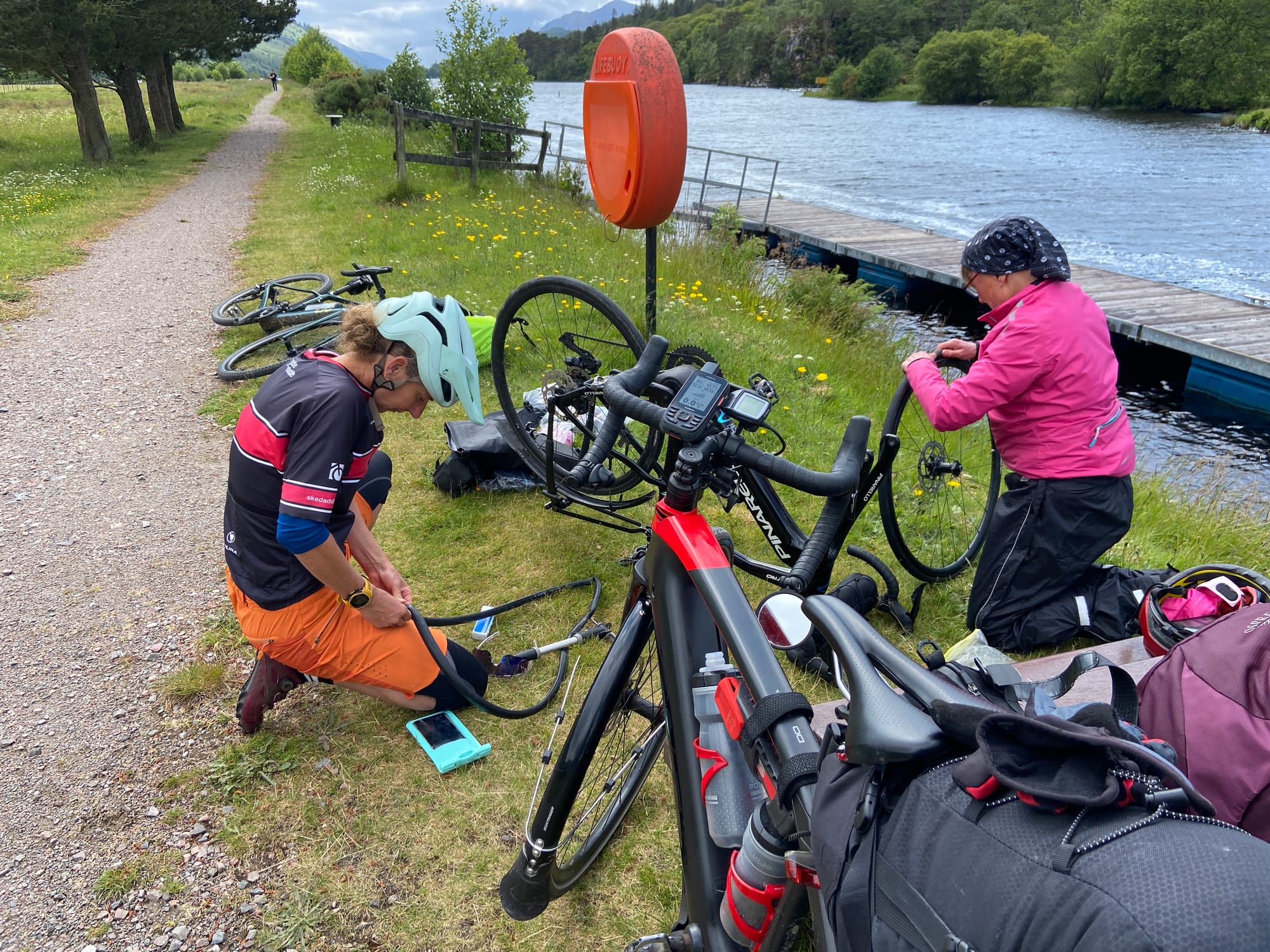 From there, we joined the Caledonian Canal and followed a beautiful cycle route for about ten miles. Just as the rain began, Liz’s tubeless tyre gave a loud bang — flat as a pancake, sealant everywhere. Unfazed, she fitted a tube in record time and we were back on the road.