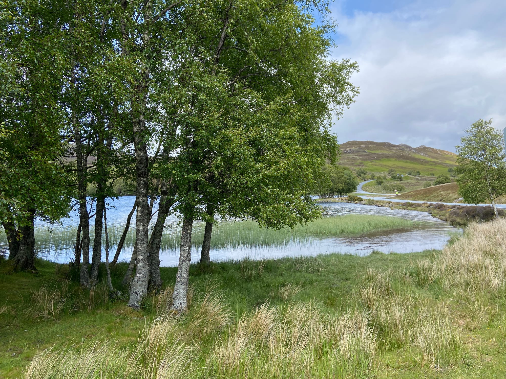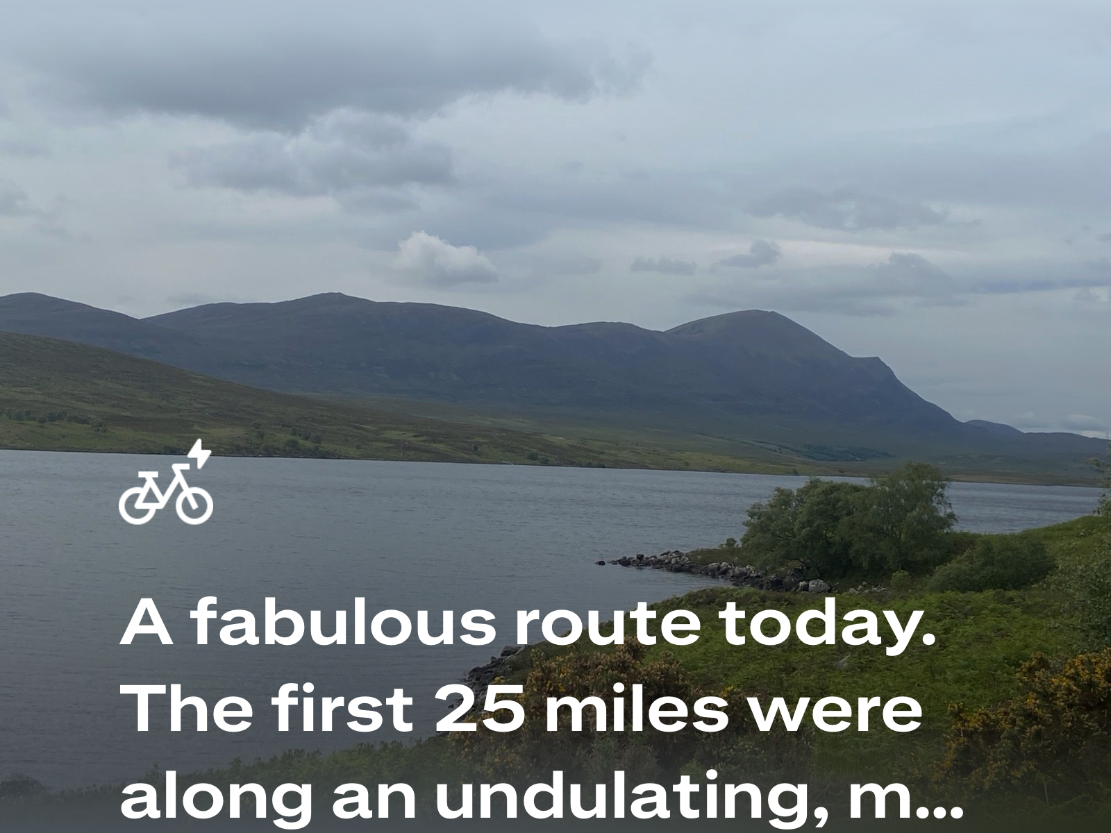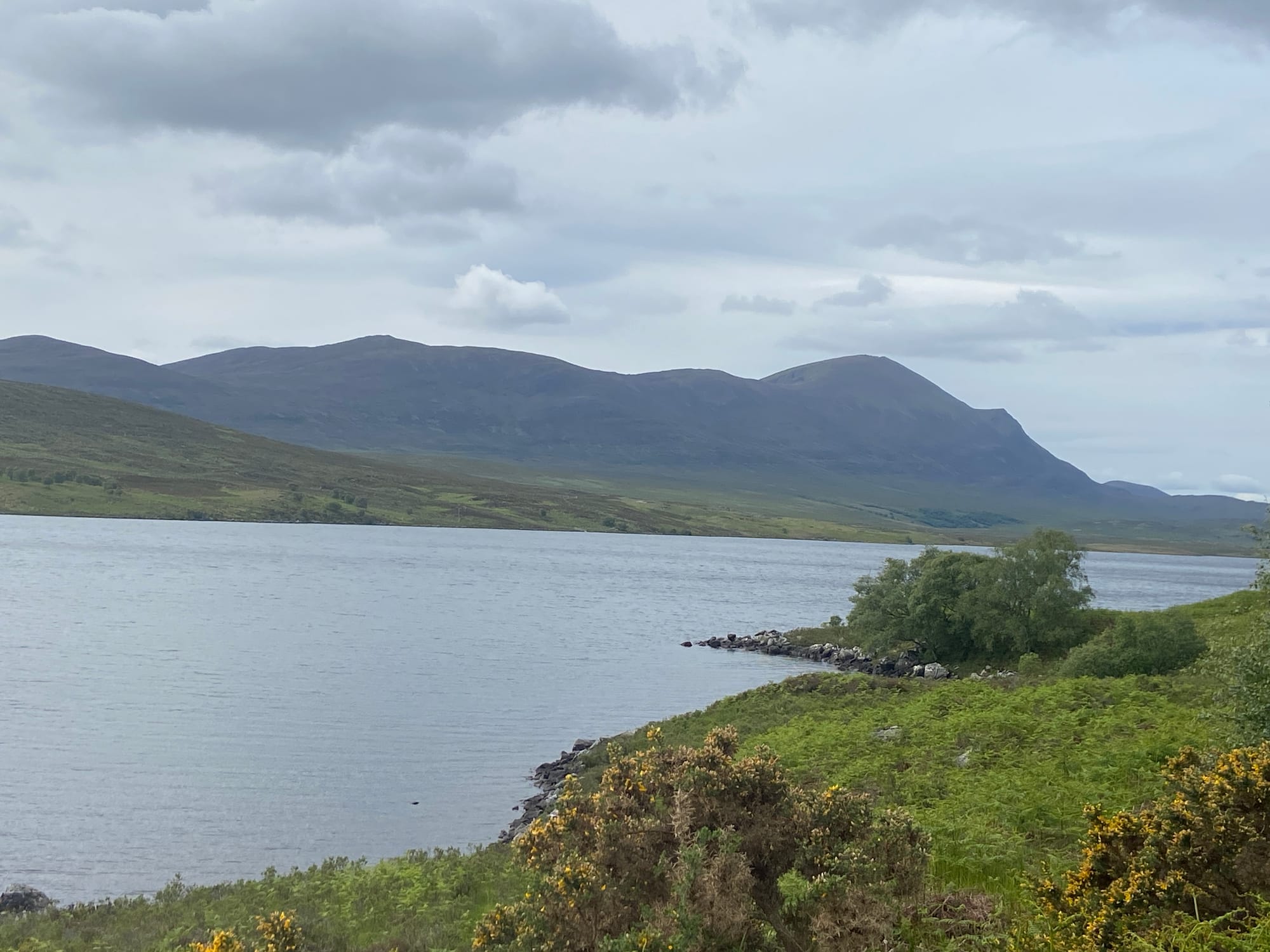We carried on until Lairg, where we found a small filling station and shop — the perfect excuse for another coffee and something to eat, with still twenty miles left to go. After leaving Lairg, the road began a long, gradual climb along a single track towards Altnaharra, made all the more testing by a persistent northerly headwind. The scenery grew wilder with every mile — open moorland, distant lochs, and the feeling of being deep in the Highlands.
