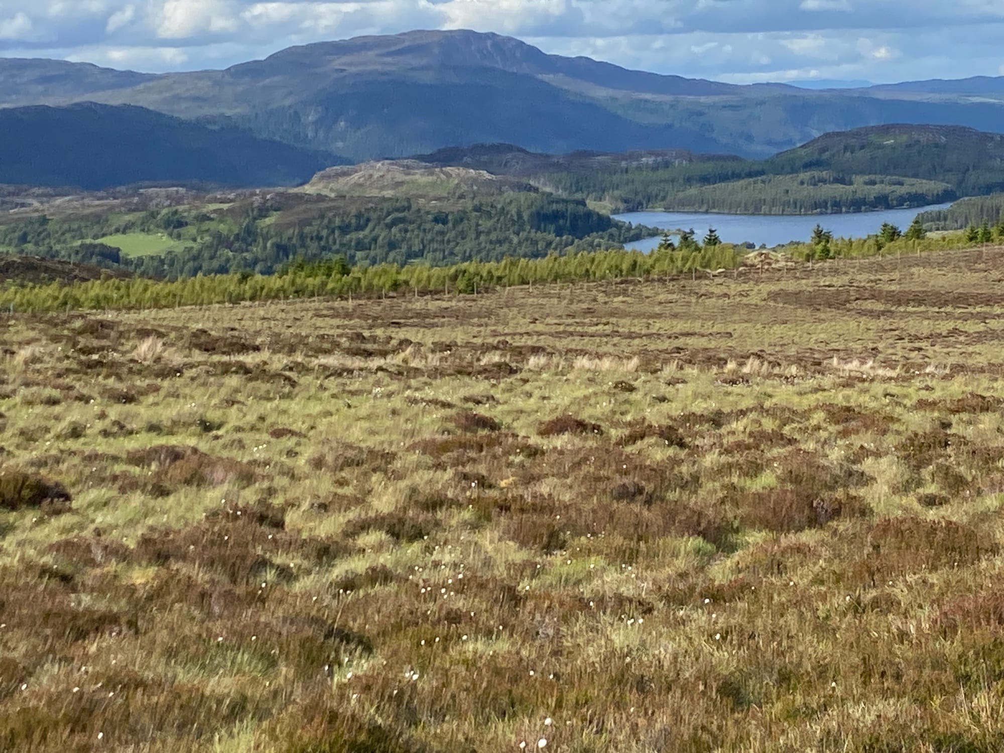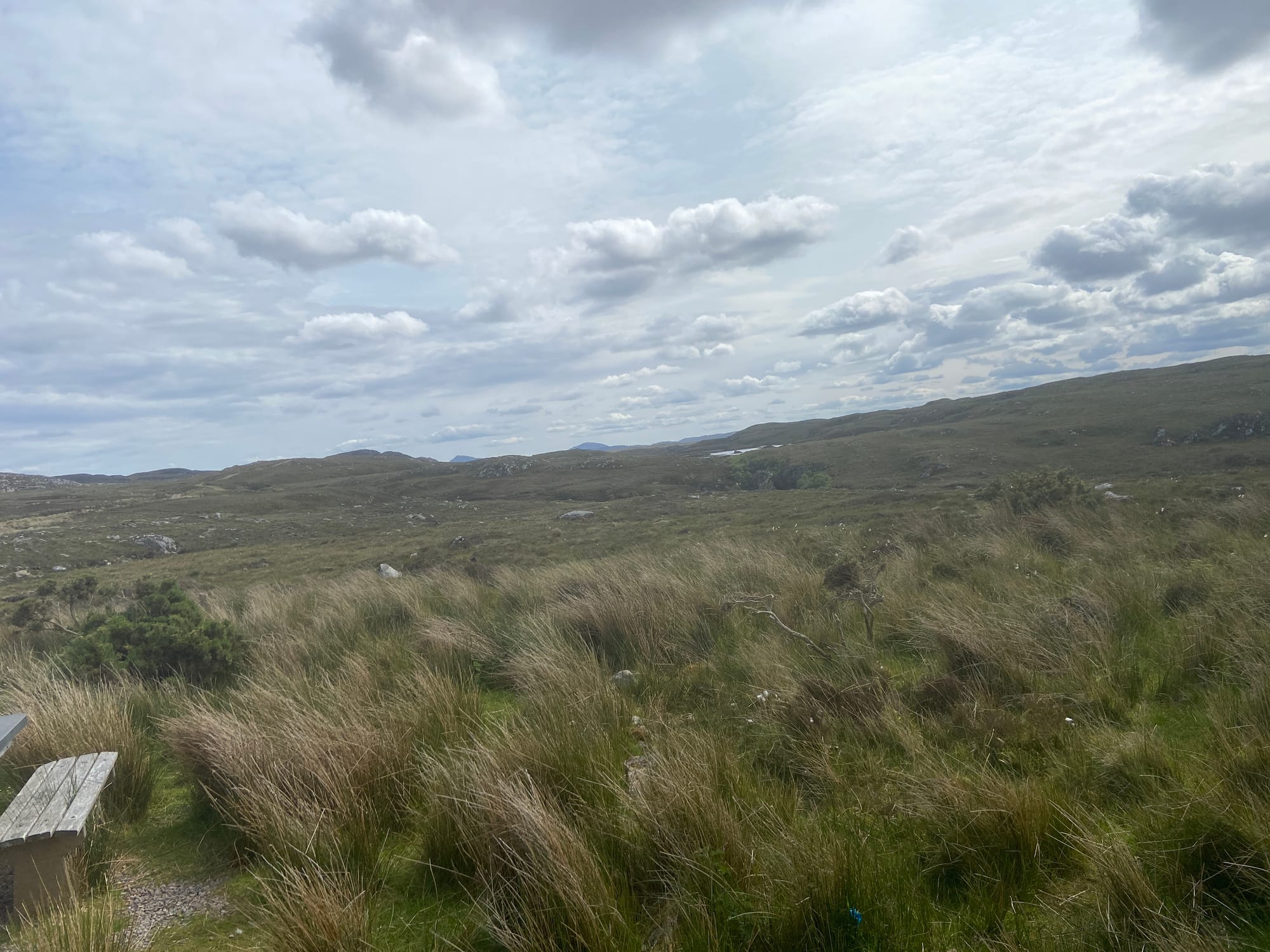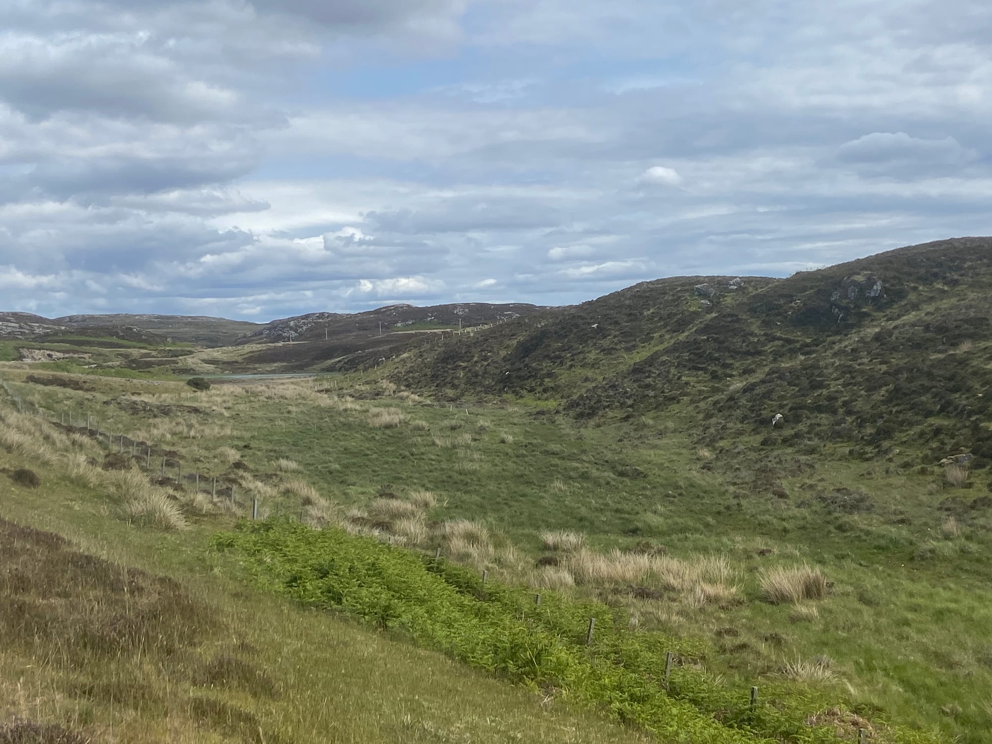 We carried on until Lairg, where we found a small filling station and shop — the perfect excuse for another coffee and something to eat, with still twenty miles left to go. After leaving Lairg, the road began a long, gradual climb along a single track towards Altnaharra, made all the more testing by a persistent northerly headwind. The scenery grew wilder with every mile — open moorland, distant lochs, and the feeling of being deep in the Highlands.