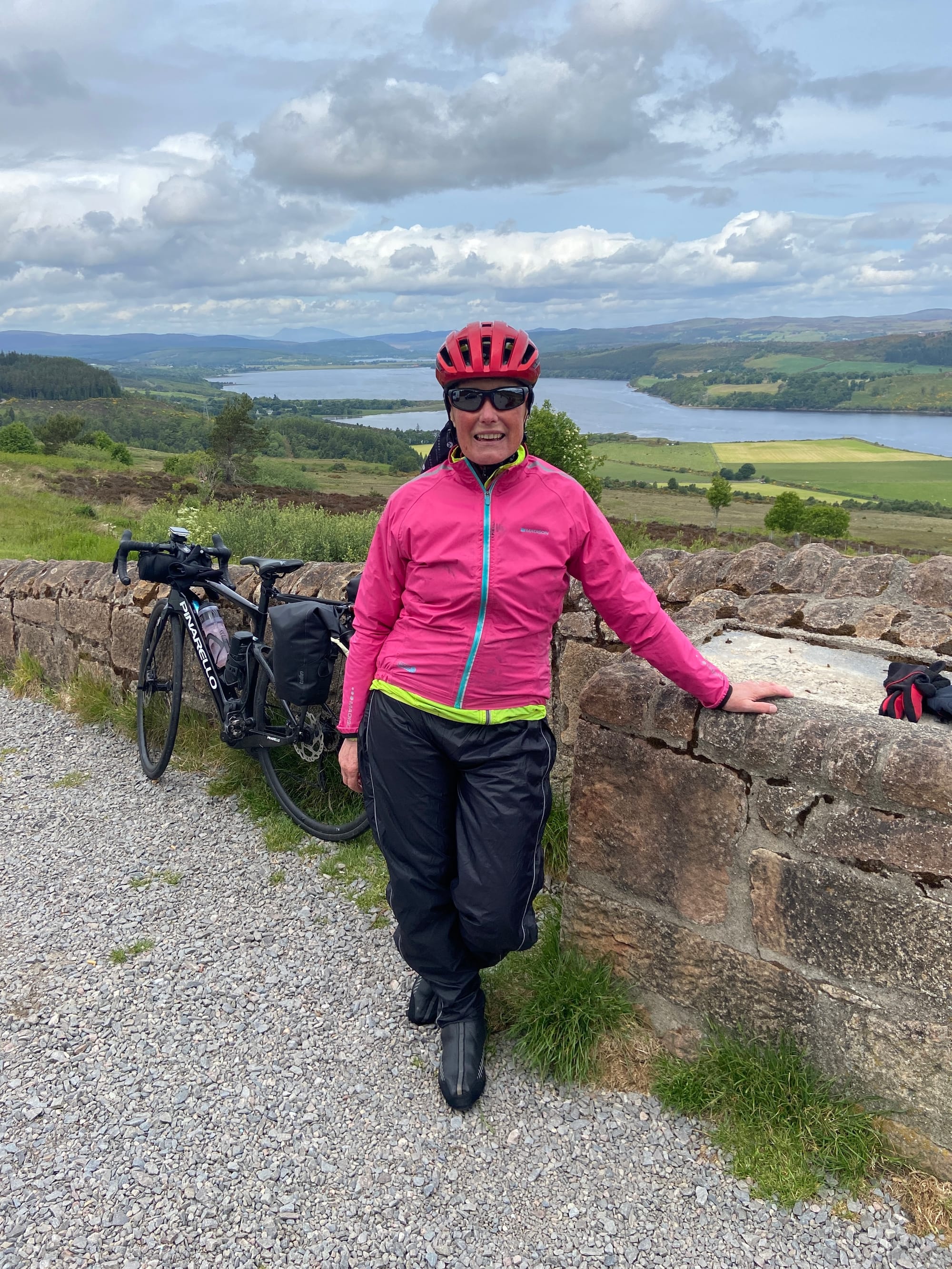 It was a testing climb from Alness to Ardgay, made even tougher by a spell of torrential rain. Then, almost without warning, the gloom lifted — the wet and dank gave way to bright skies and cheerful light as we reached the top. We paused at a viewpoint above Ardgay to admire the beautiful views over the Dornoch Firth, where we met a lively group of guys in a mix of sporty cars who had driven up from Chester for a weekend in the Highlands — small world!