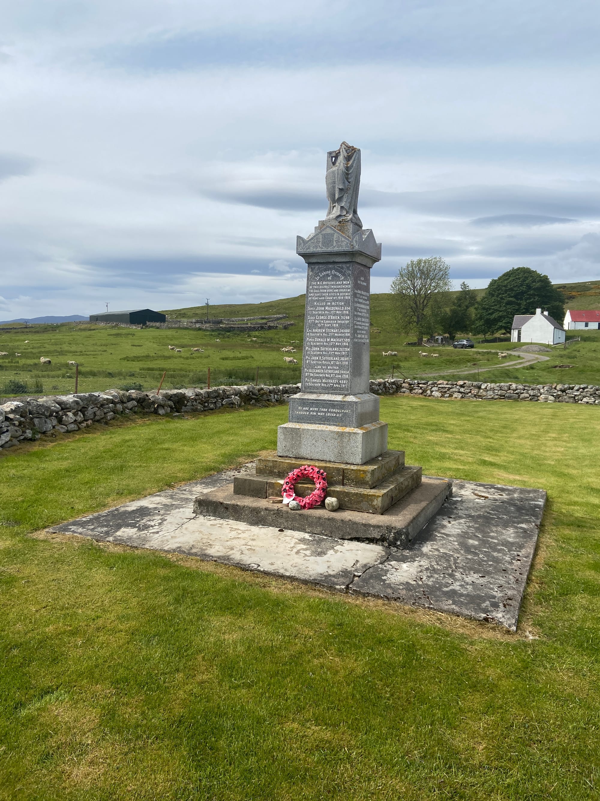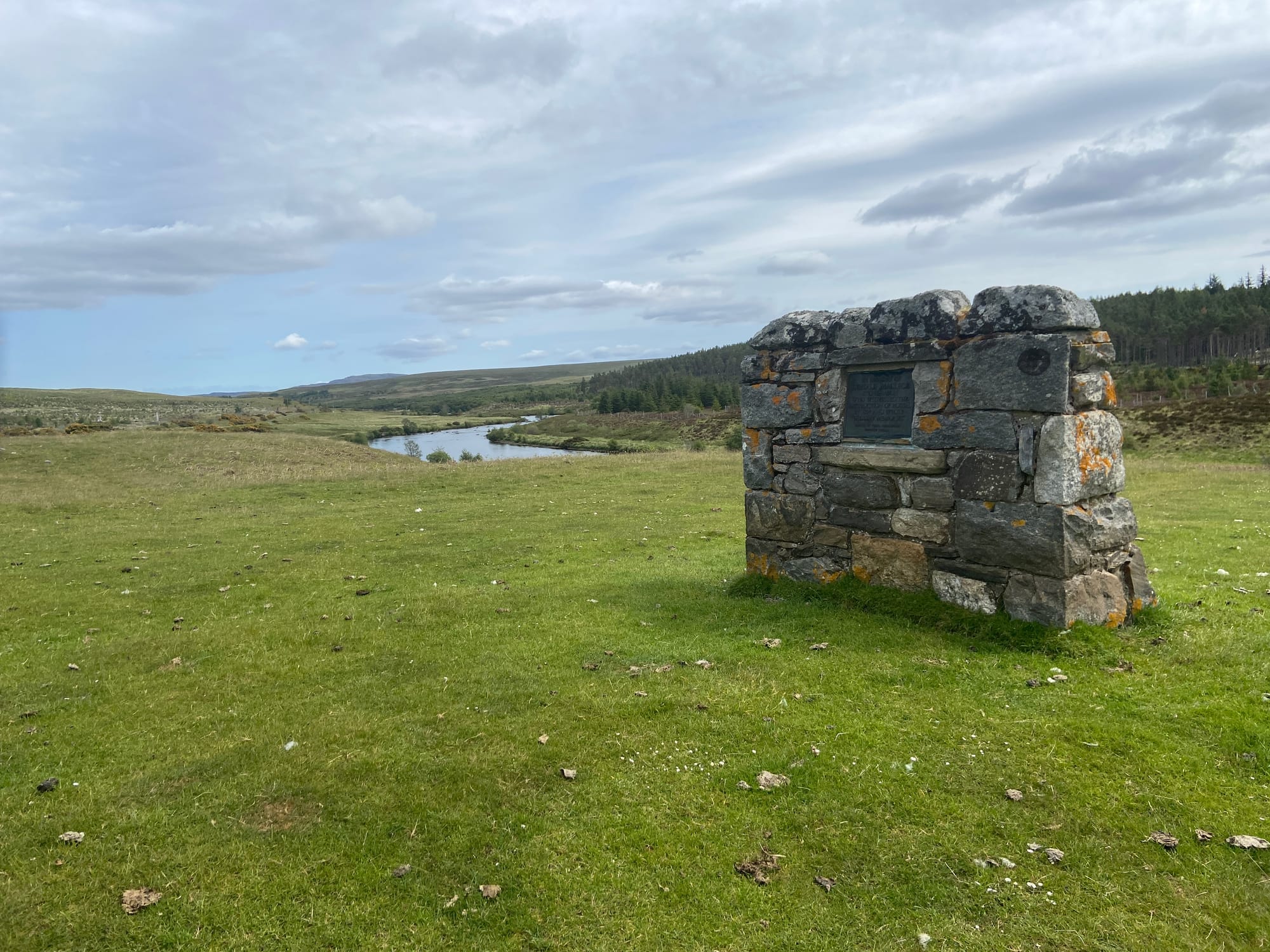 This was truly wild and rugged Highland terrain — vast moors, distant mountains, and the road tracing the line of the river. We stopped to take photos at the Mackay Country Stone, which sits just off the roadside. Carved into it is the word “Fàilte” — Gaelic for welcome. The stone marks the southern boundary of Mackay Country, the traditional territory of the Mackay clan, a fitting landmark as we rode deeper into the far north..