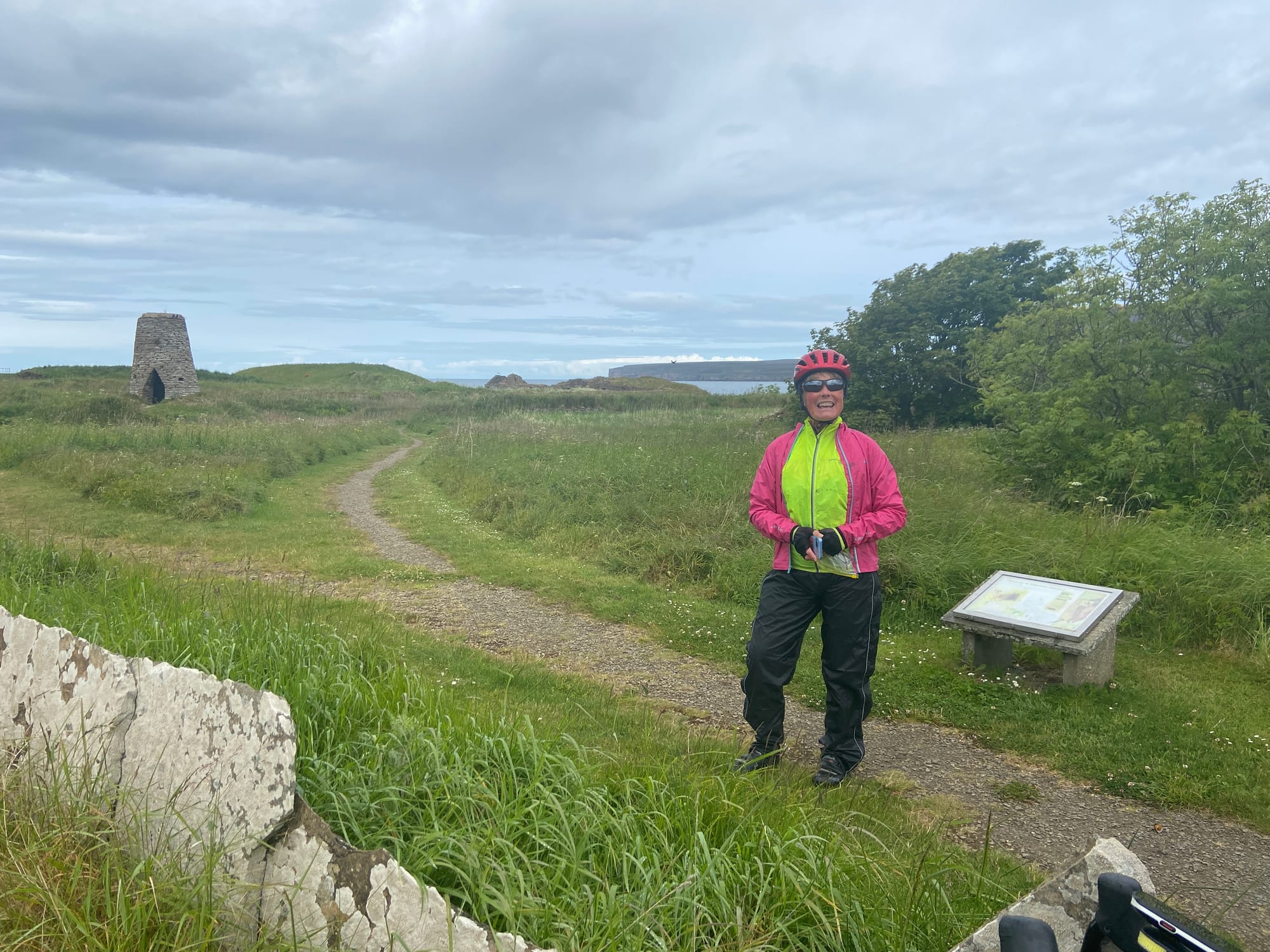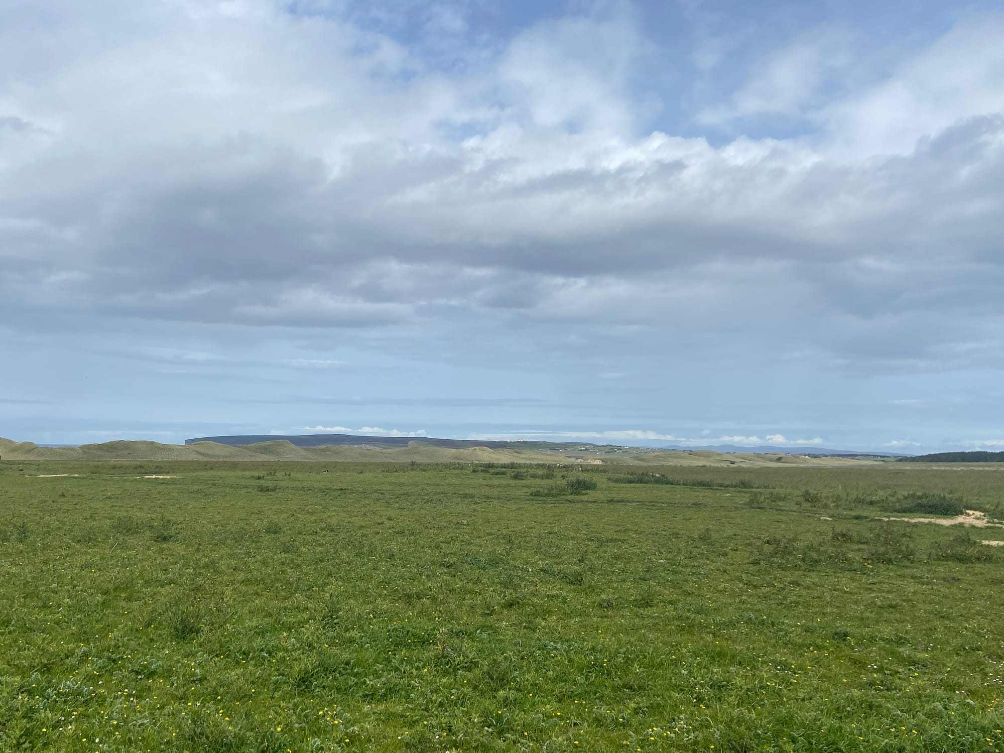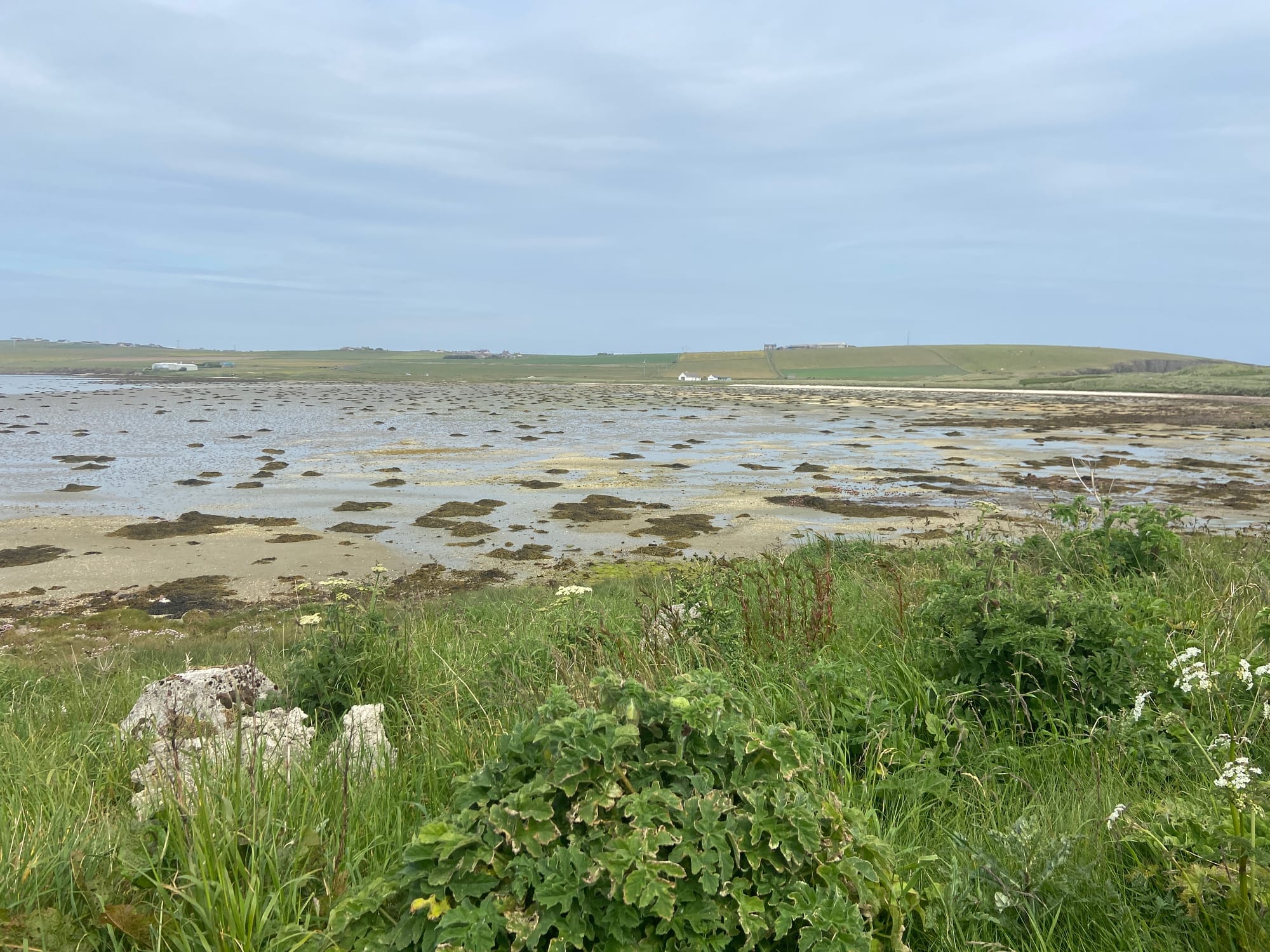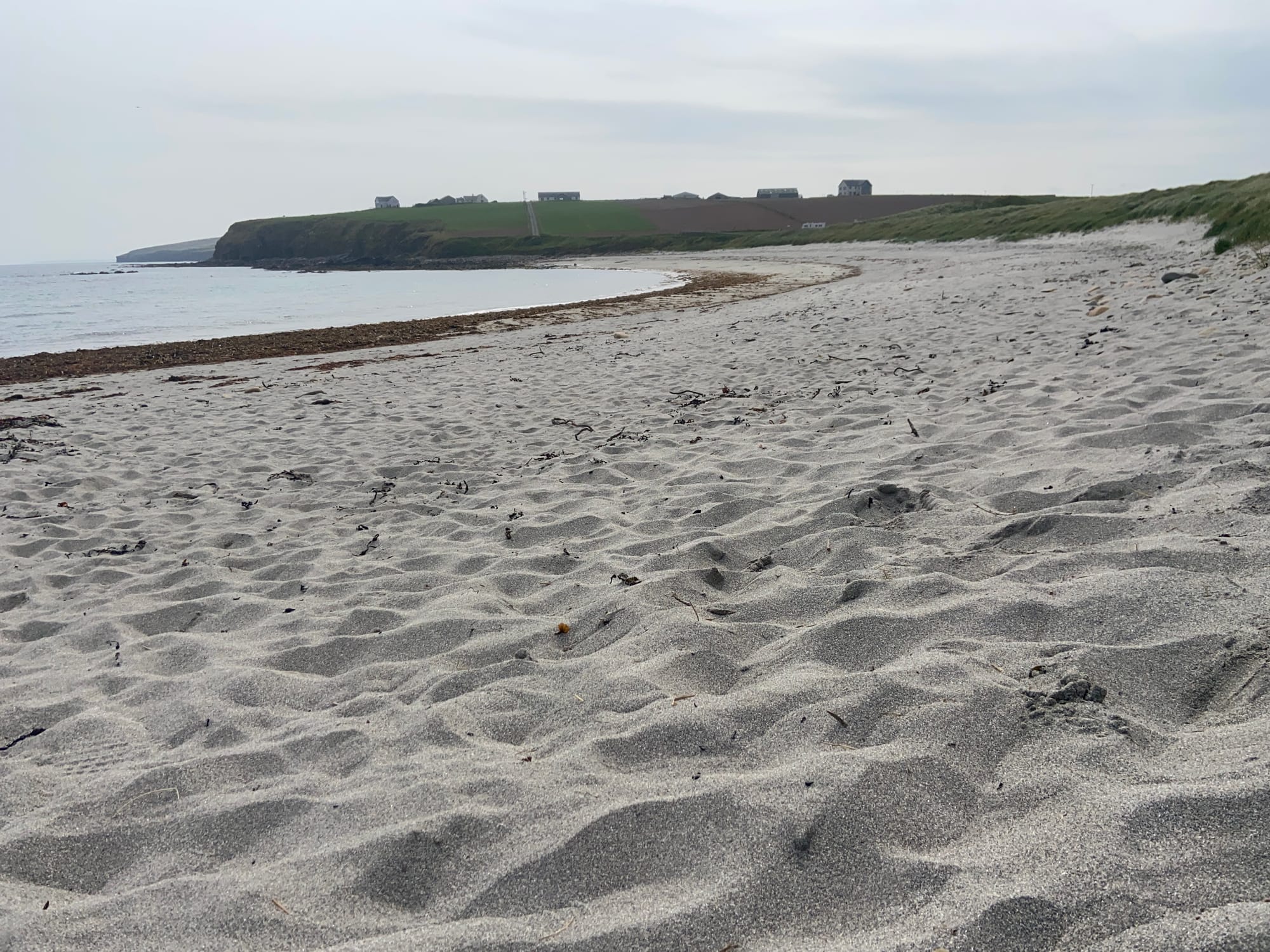 As we left Kirkland, we were met almost immediately by a fierce headwind on the road past the airport towards Deerness. It was hard going, but the Orkney landscape made up for it — wide skies, low rolling fields, and glints of sea on both sides. We stopped near Dingieshowe Beach and walked across the dunes, the wind tugging at our jackets. The views across Taracliffe Bay were amazing — wild, empty, and quietly beautiful.