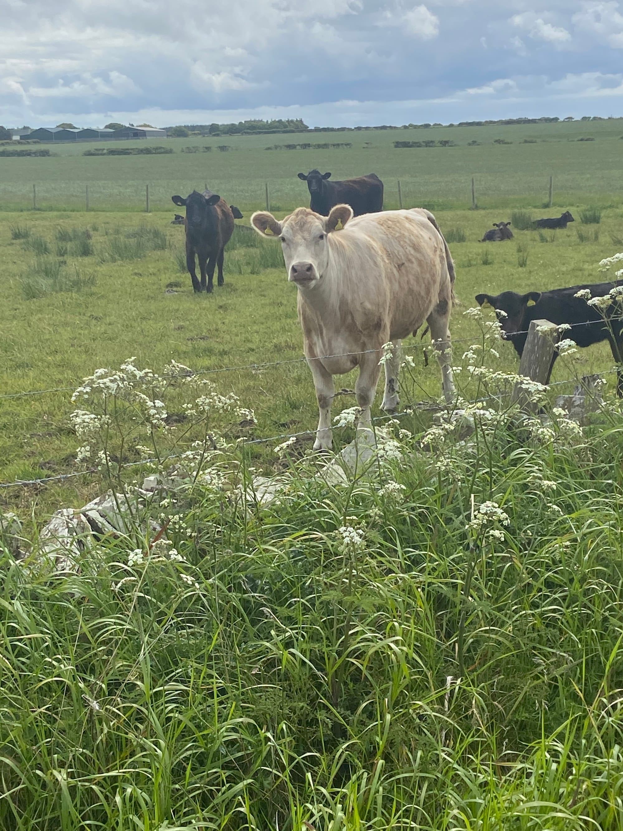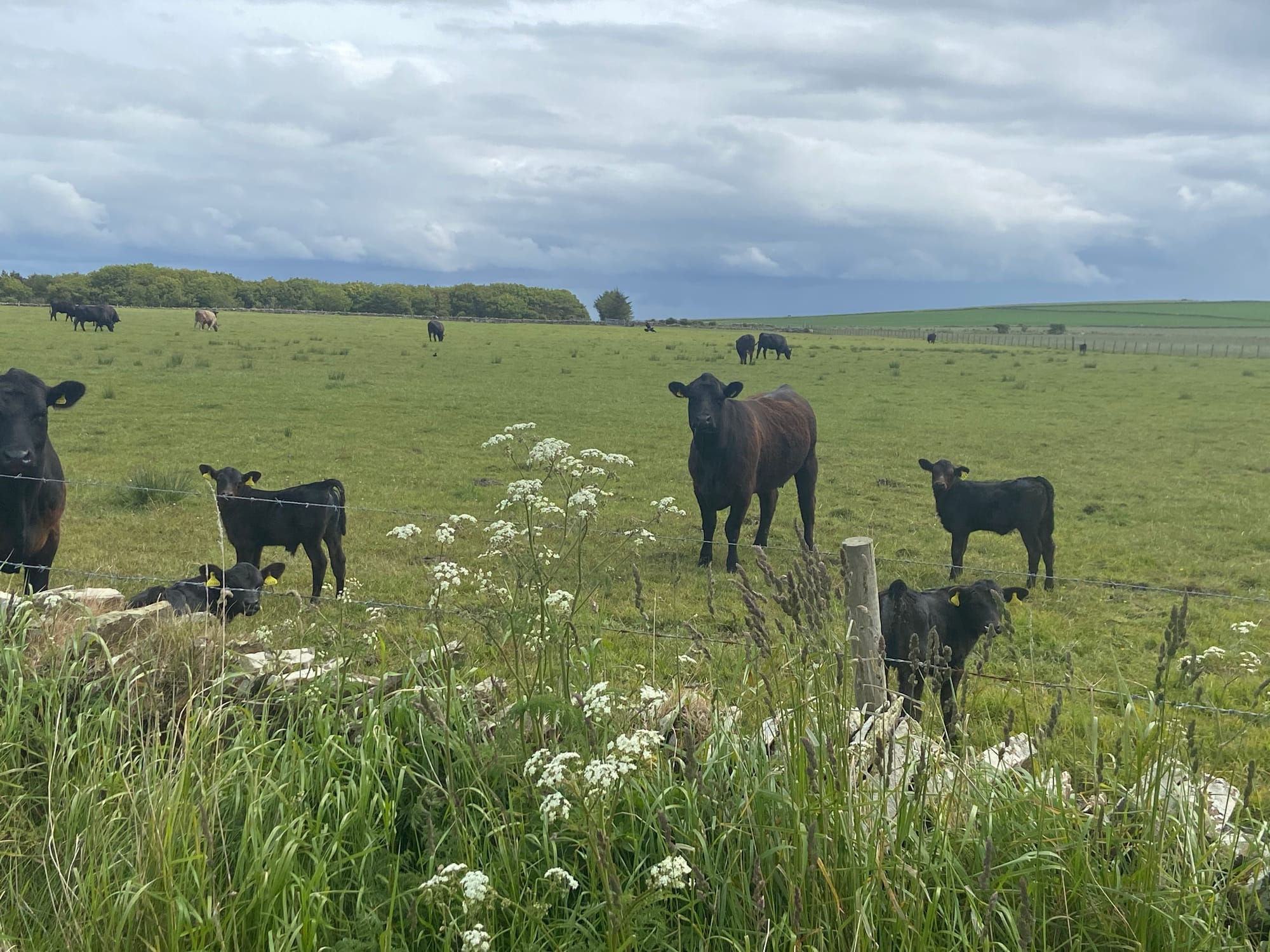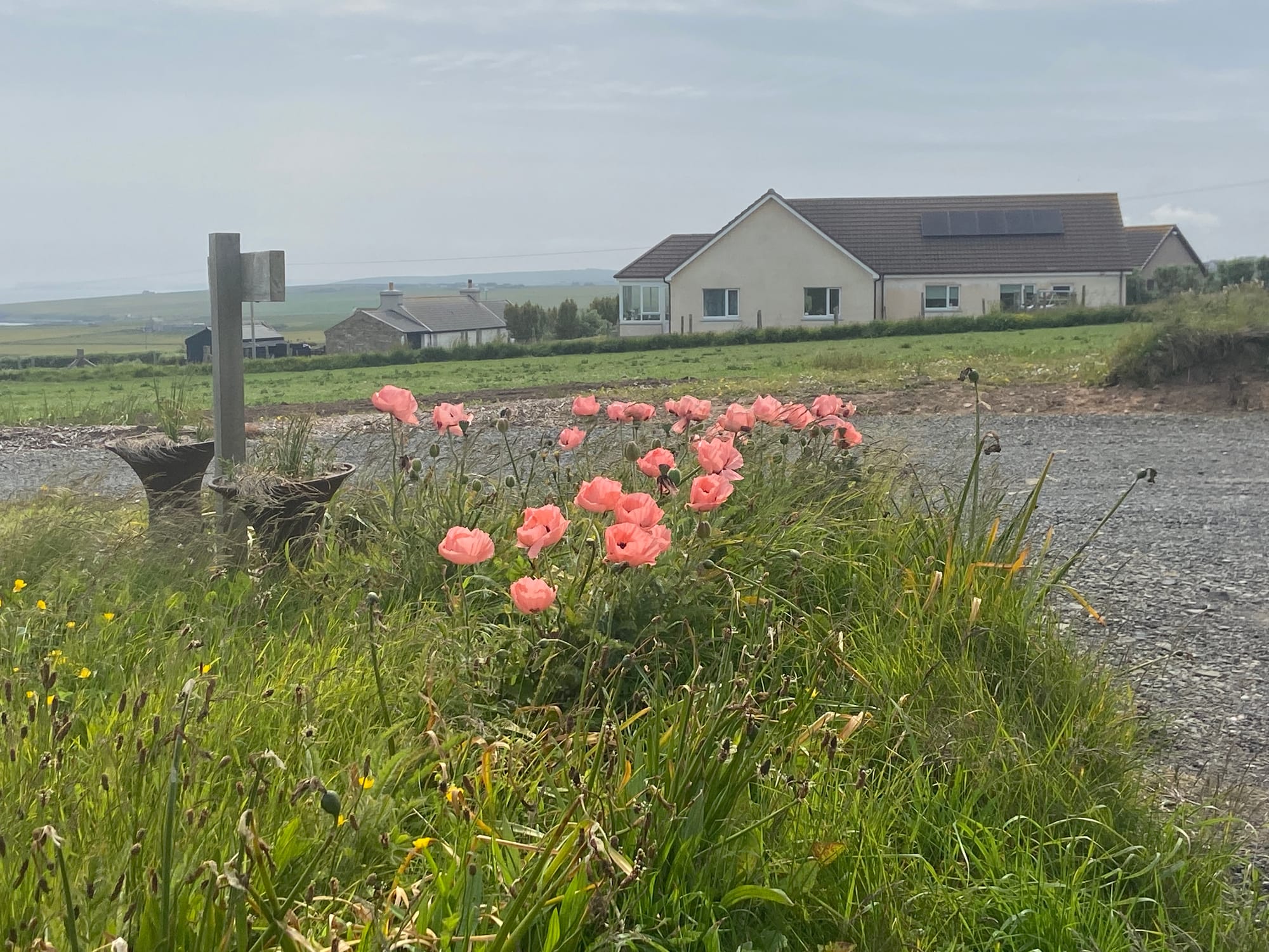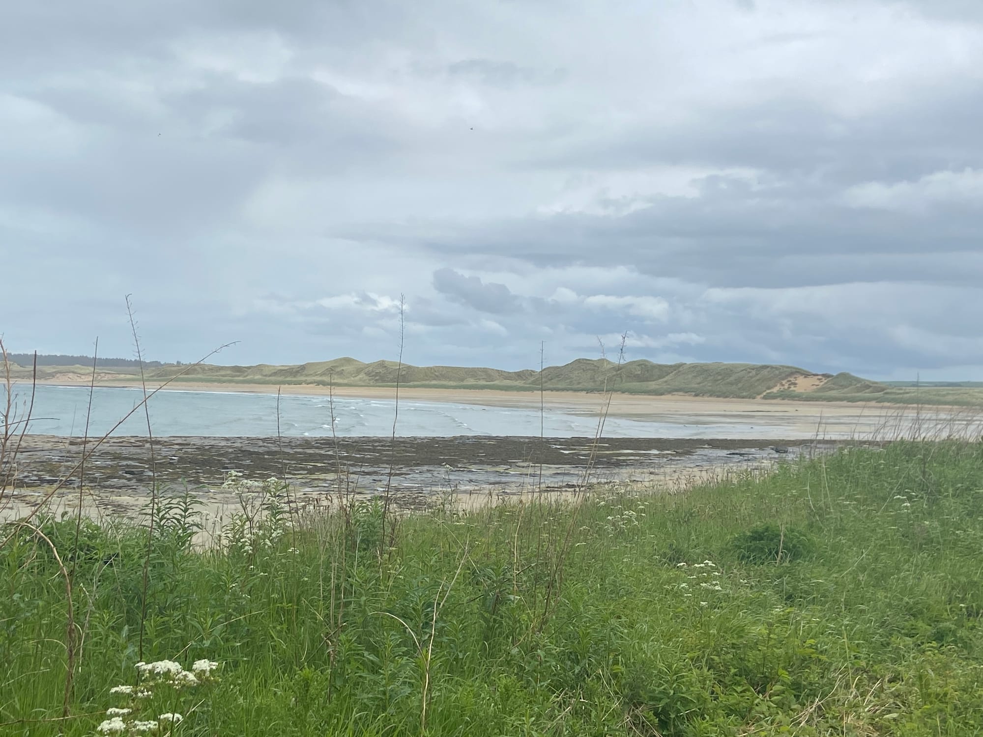 As we left Kirkland, we were met almost immediately by a fierce headwind on the road past the airport towards Deerness. It was hard going, but the Orkney landscape made up for it — wide skies, low rolling fields, and glints of sea on both sides. We stopped near Dingieshowe Beach and walked across the dunes, the wind tugging at our jackets. The views across Taracliffe Bay were amazing — wild, empty, and quietly beautiful.