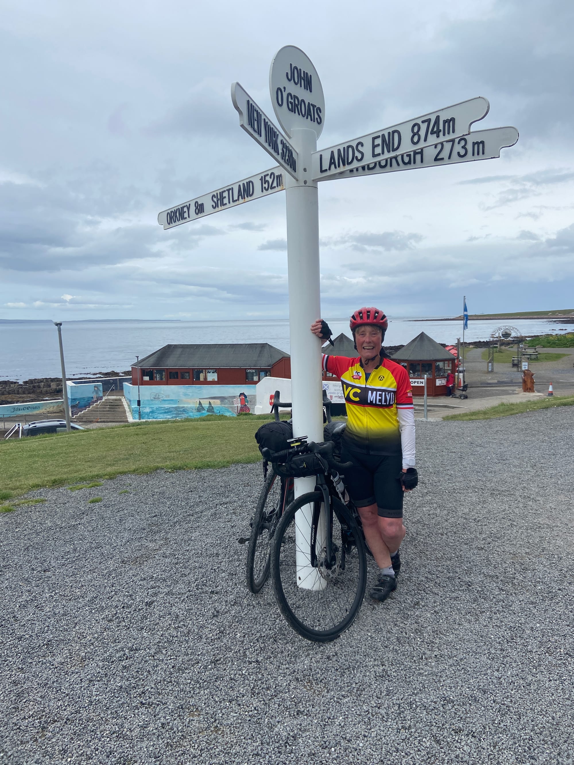 All too soon, we arrived at John O’Groats. The place was buzzing — coaches, cars, and crowds of sightseers filled the car park, everyone drawn to this famous northern landmark. We joined the queue at the iconic signpost for our own set of photos, surrounded by other cyclists celebrating the end of their epic journeys. I couldn’t have been prouder of Liz — after twenty-three days on the road, she’d completed an extraordinary adventure. What an achievement!
