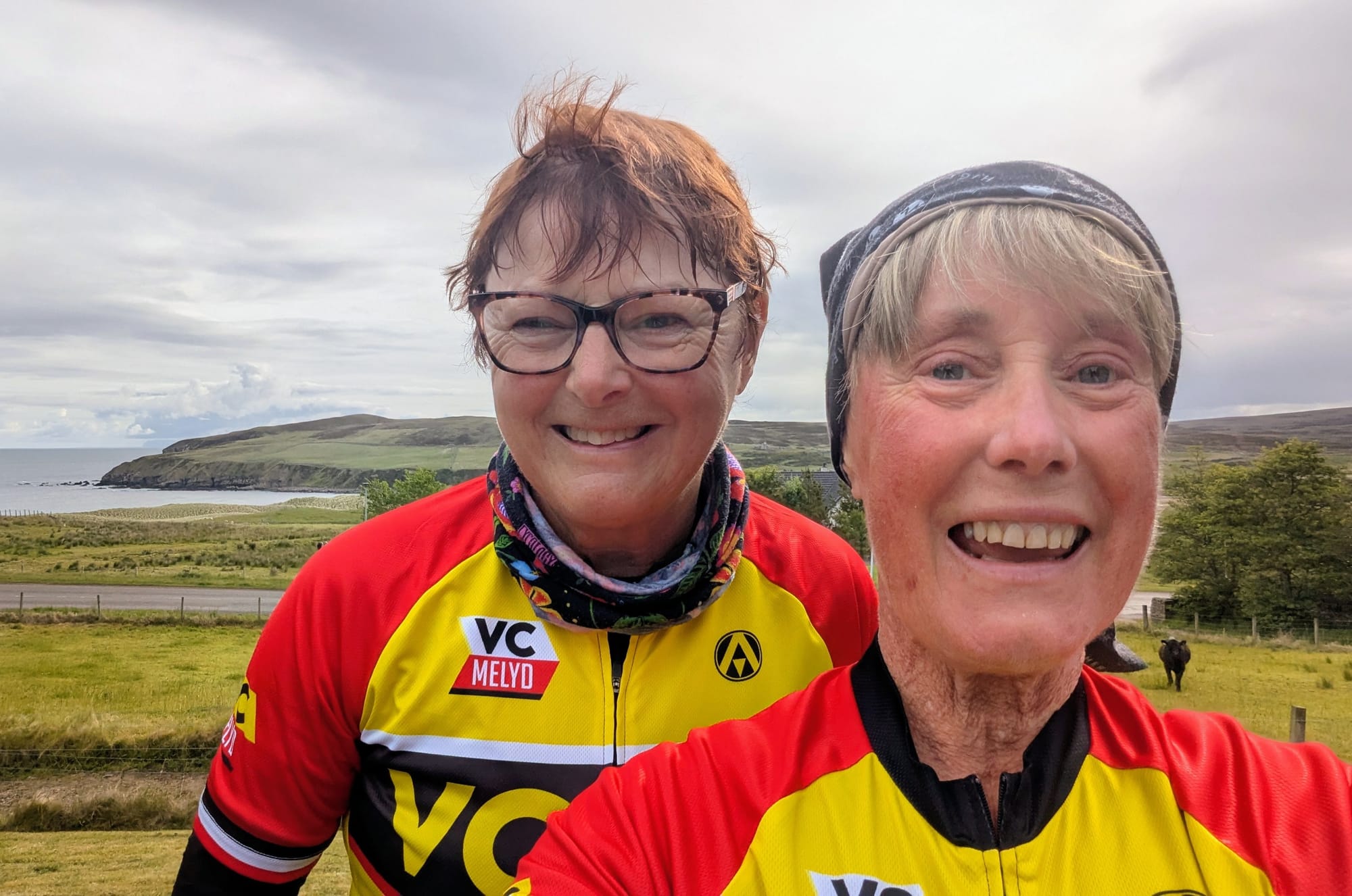 It was an early start, with absolutely no mechanical issues and a tailwind all the way — the perfect send-off for our final day on the road. The ride was exhilarating, with a few stiff climbs and rolling hills adding just enough challenge to make it interesting. Before setting off, we posed for photos in our VC Melyd jerseys outside the B&B, marking the start of the last leg of Liz’s incredible journey. She’s been on the road for twenty-three days, covering hundreds of miles through ever-changing landscapes — from canals and glens to lochs, moors, and rugged coastlines — and today she would finally reach John O’Groats, the iconic end of the road.