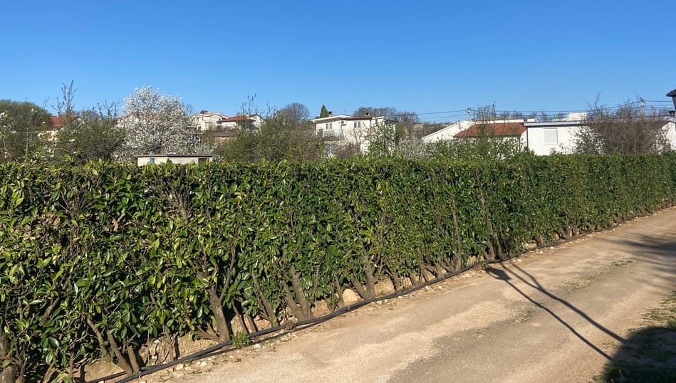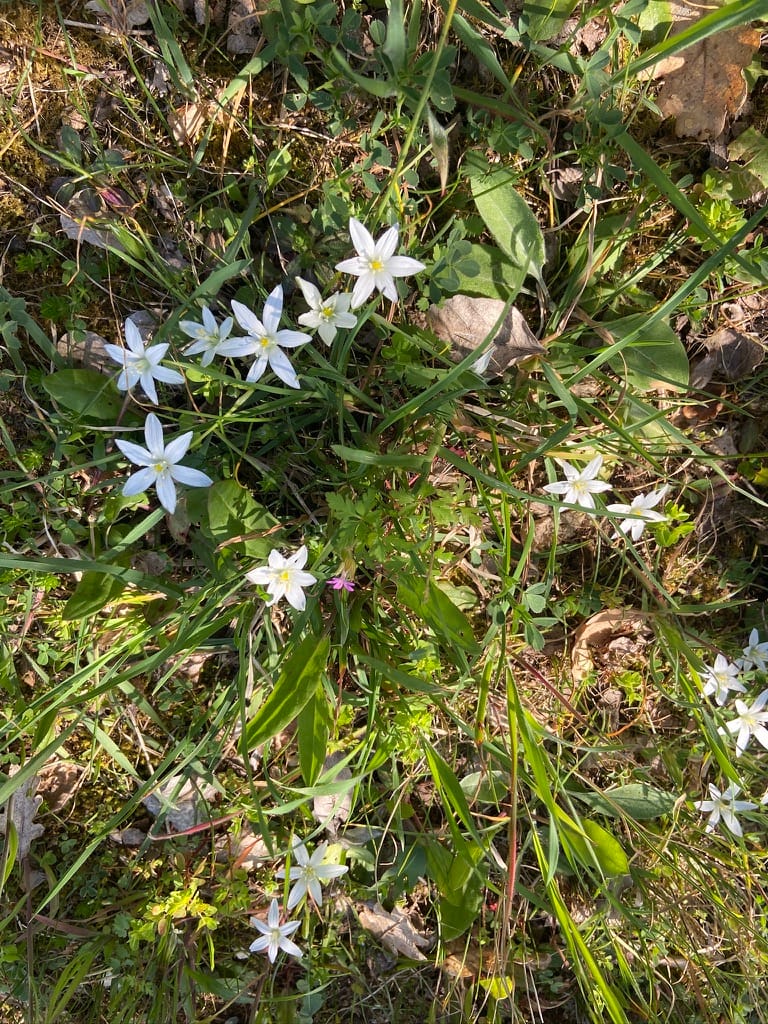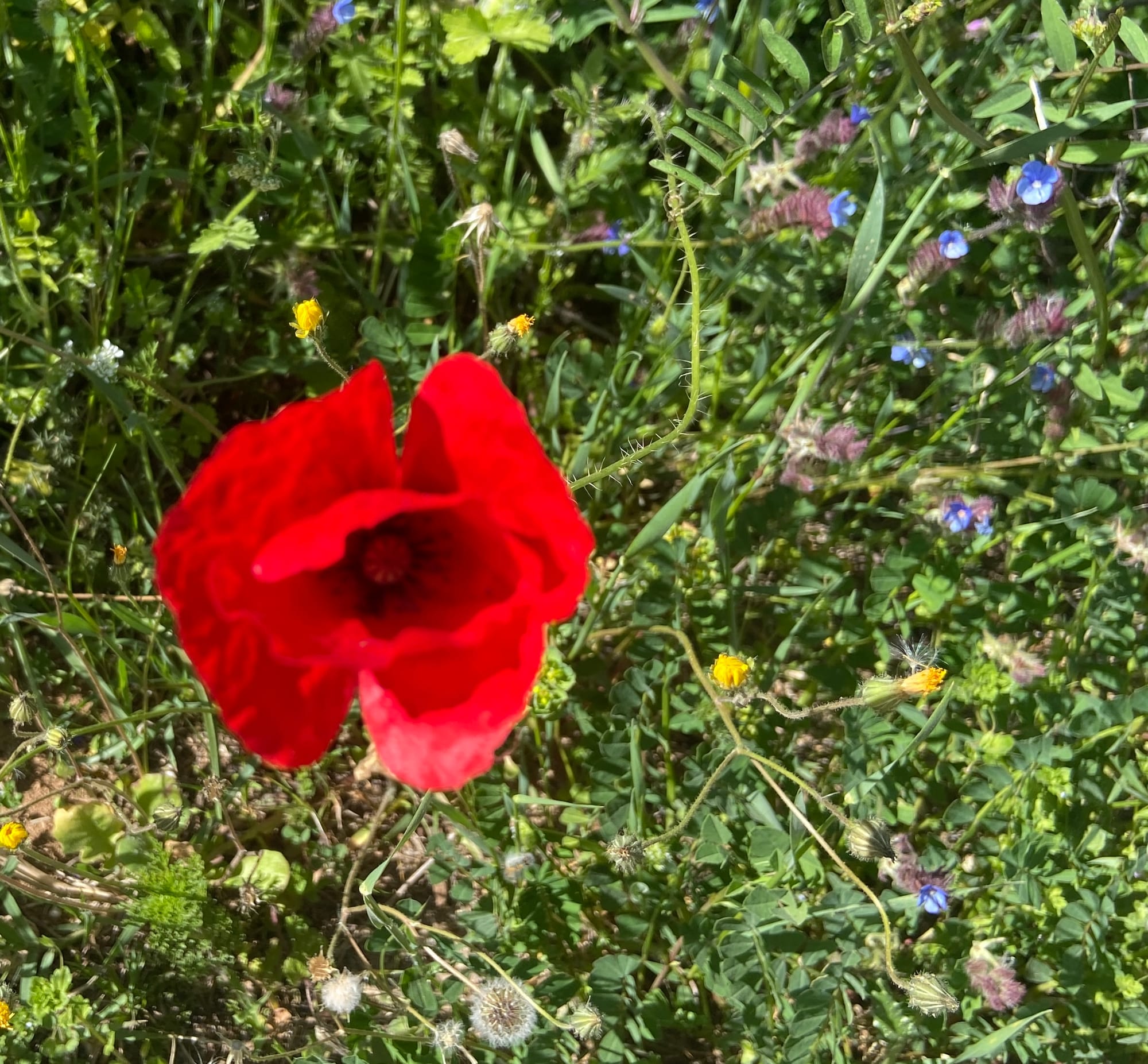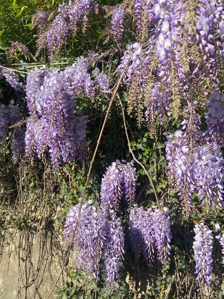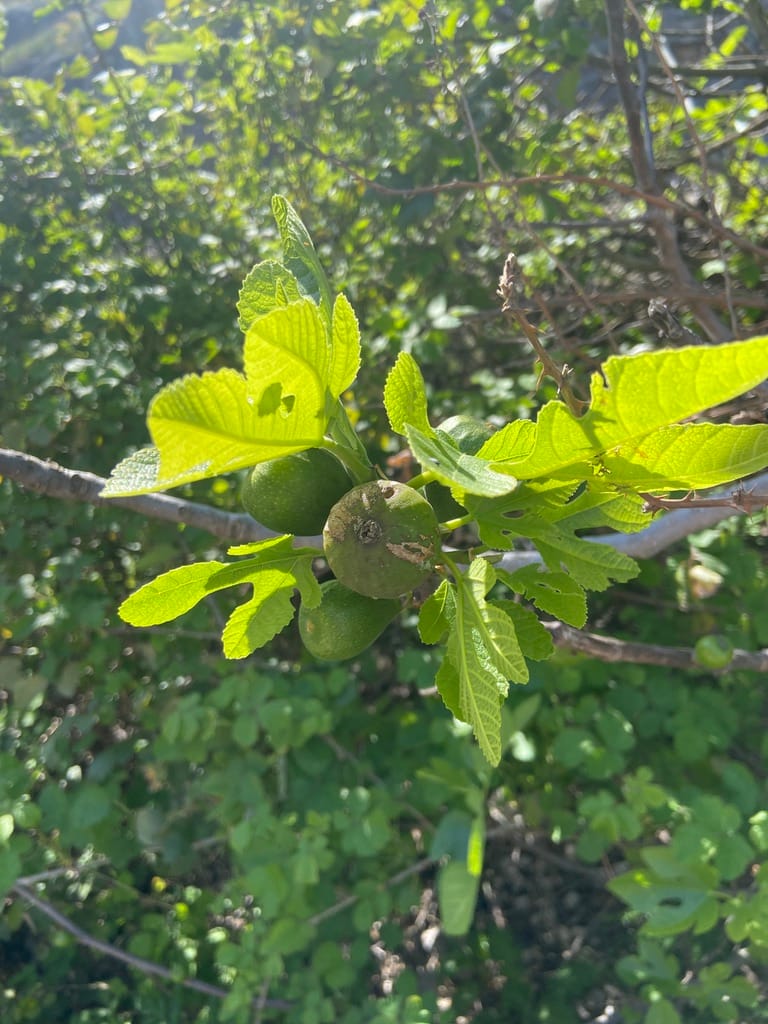 The hedgerows were full of colour too — yellows, pinks and whites — and we even spotted a fig tree already heavy with young fruit.