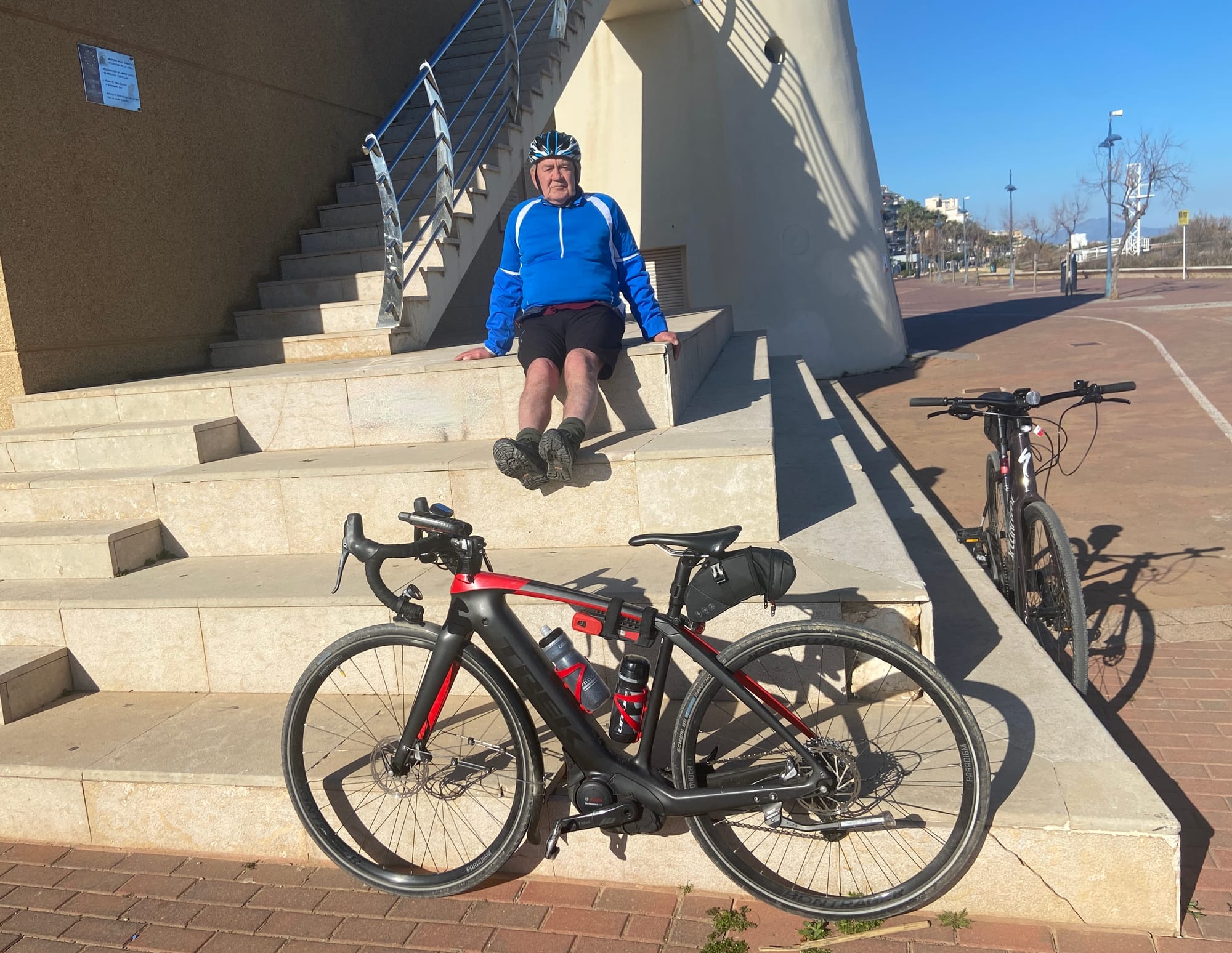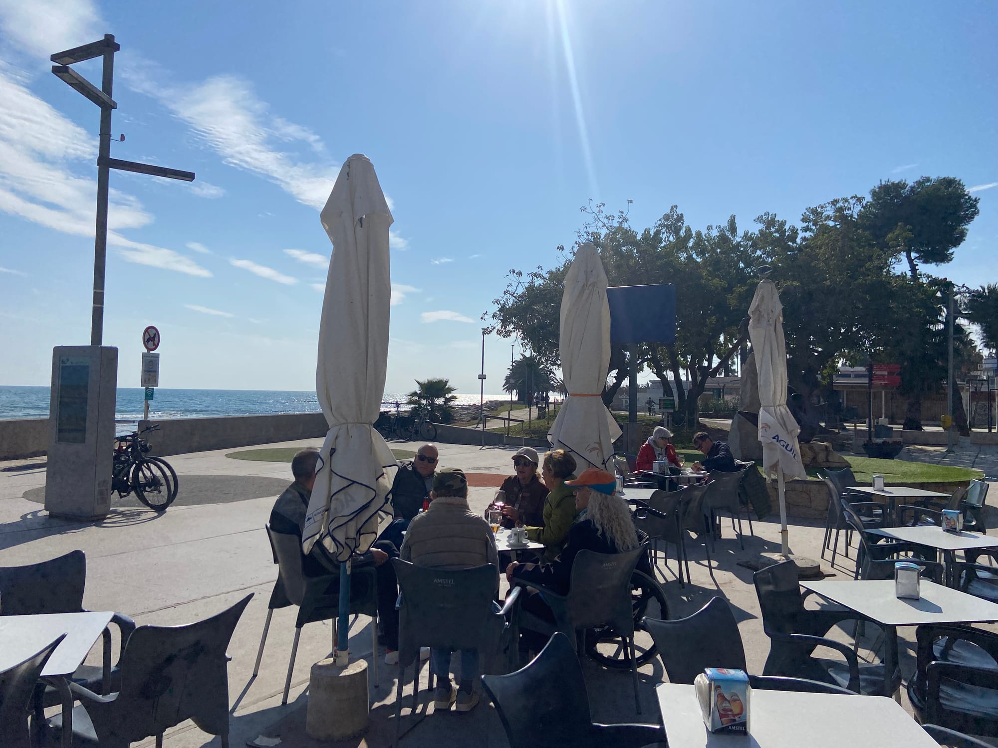 We headed out on the bikes and spent the day pottering , covering around 13 miles. Lunch was in a local port of Benicarló — a relaxed café with outdoor seating. Coffee, savoury pastries and cake hit the spot before we followed the coast road back towards Peñíscola, riding close to the beach with plenty of stops to take photos and enjoy the sunshine.