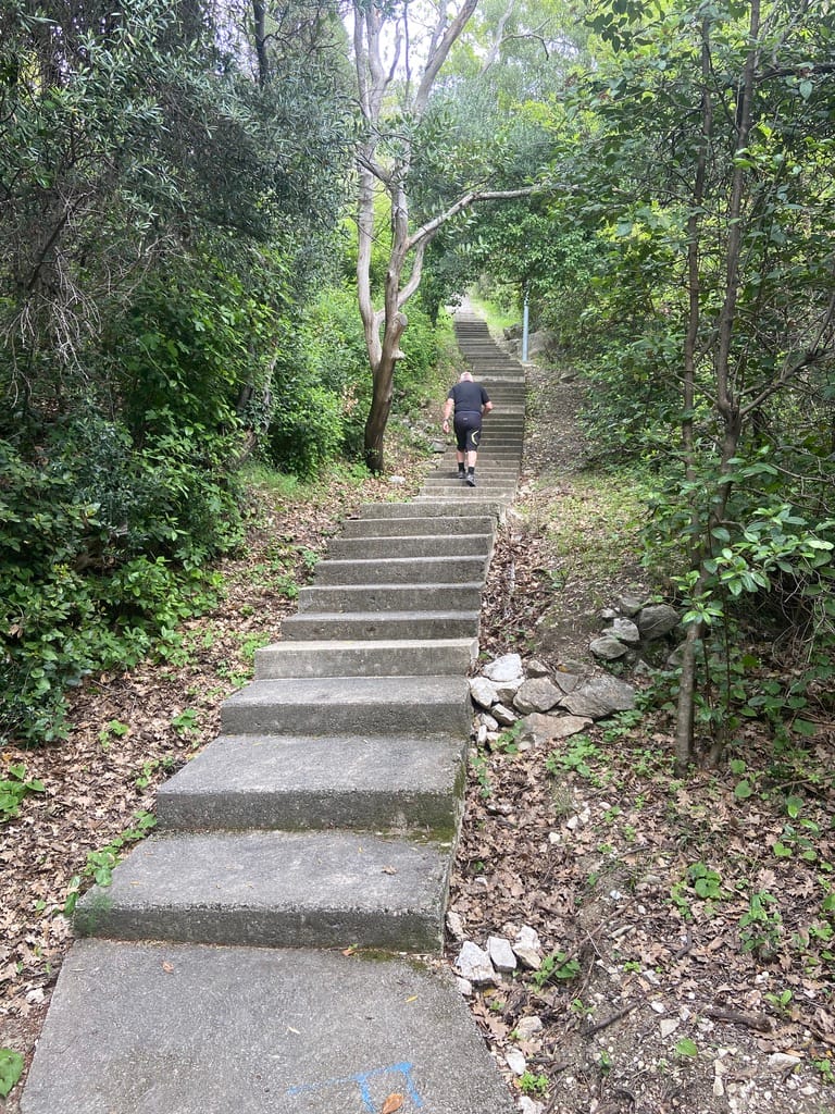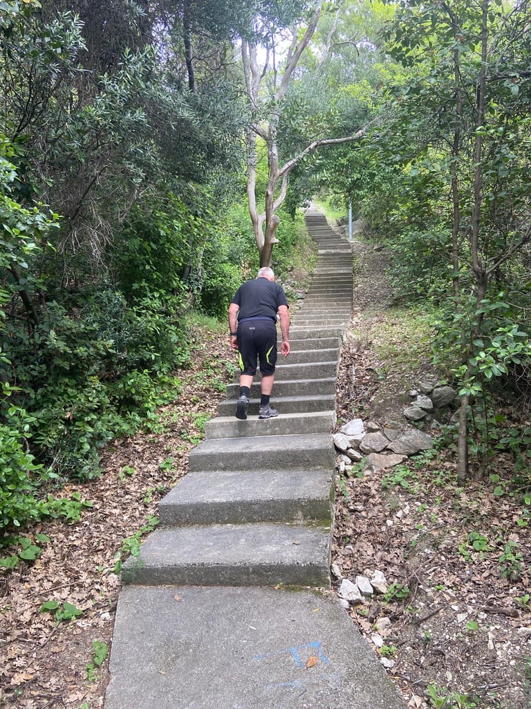 That made us smile as we headed down the many steps to the beach, found the route, and then promptly climbed 510 steps straight back up. Followed by a steep road, more steps, and eventually it eased off. By then we were well up the hillside behind the campsite.