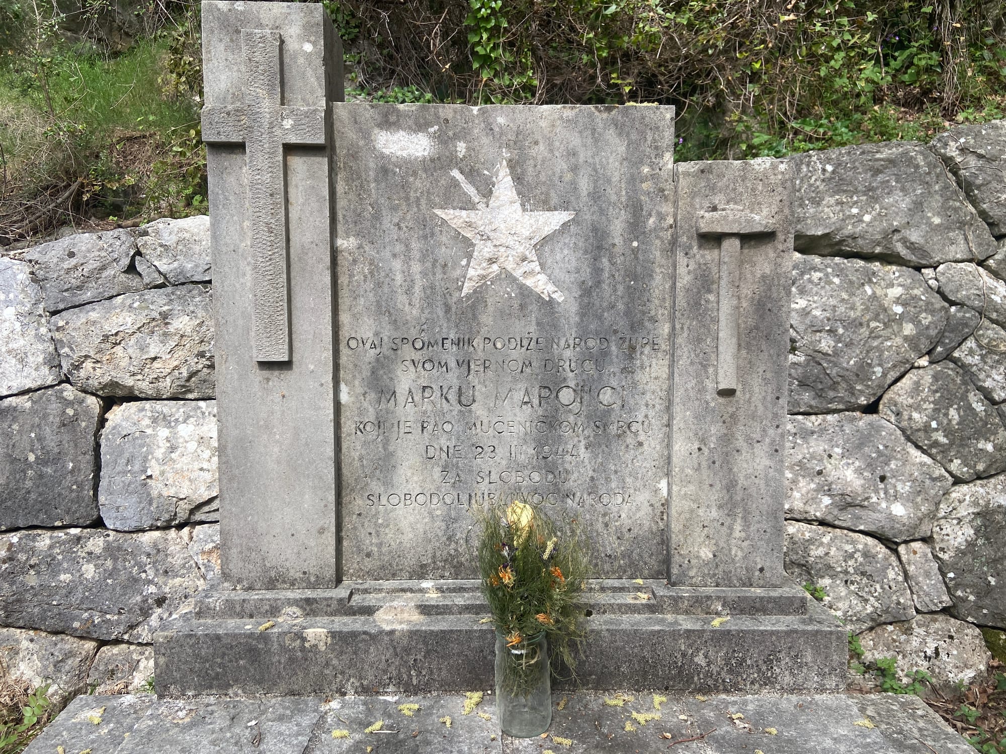 Along the walk we passed a small memorial tucked into the hillside, with an inscription remembering a local man who died in 1944. It was a sad but moving reminder of the history held in these peaceful places.
